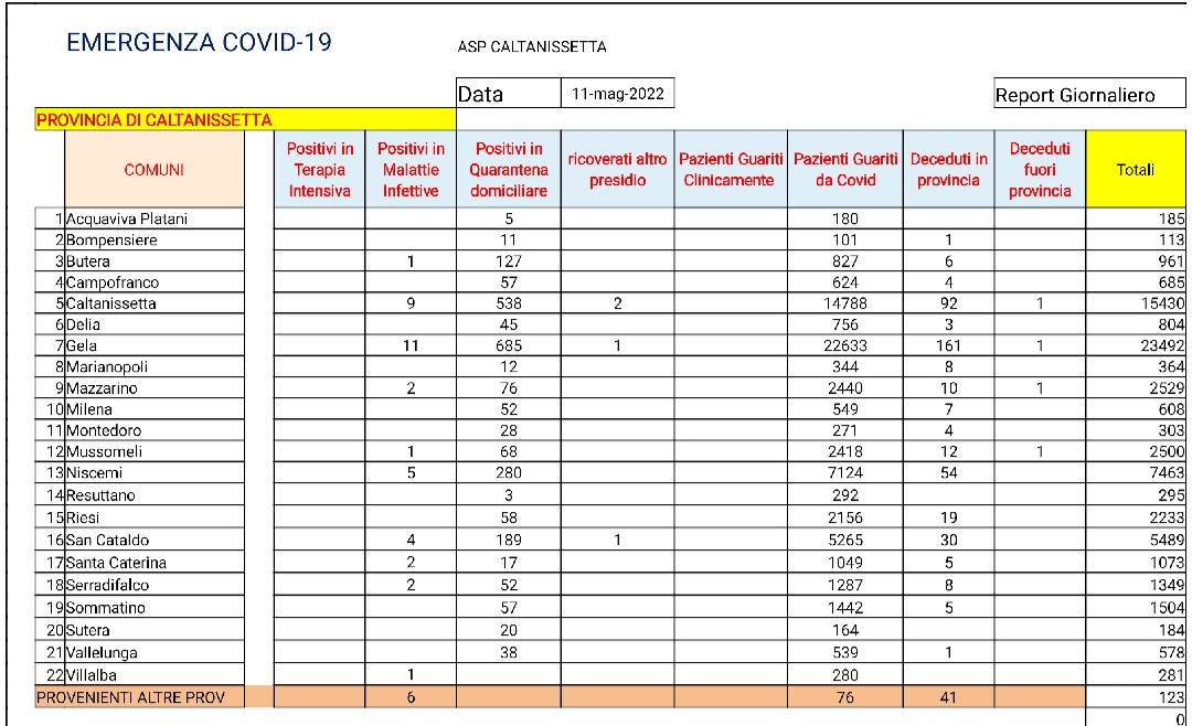 Caltanissetta: A Gela il numero dei positivi scende sotto i 700. Nelle ultime 24 ore riscontro di 137 pazienti positivi al SARS CoV-2, tutti in isolamento domiciliare: 45 pazienti di Caltanissetta, 29 di Gela, 9 di Mazzarino, 9 di Niscemi, 7 di San Cataldo, 6 di Serradifalco, 6 di Campofranco, 6 di Butera, 5 di Mussomeli, 4 di Riesi, 3 di Sutera, 2 di Sommatino, 2 di Santa Caterina Villarmosa, 1 di Delia, 1 di Marianopoli, 1 di Milena e 1 di Montedoro. Ricoverato in degenza ordinaria 1 paziente proveniente da fuori provincia. Dimessi dalla degenza ordinaria: 2 pazienti di Caltanissetta e 1 di San Cataldo. Guariti da Covid-19: 63 pazienti di Gela, 56 di San Cataldo, 54 di Caltanissetta, 27 di Niscemi, 24 di Serradifalco, 9 di Mazzarino, 6 di Santa Caterina Villarmosa, 5 di Riesi, 4 di Butera, 4 di Milena, 4 di Mussomeli, 3 di Campofranco, 3 di Sommatino, 3 di Sutera, 2 di Delia, 2 di Marianopoli, 2 di Montedoro, 2 di Resuttano, 1 di Acquaviva Platani e 1 di Vallelunga Pratameno.