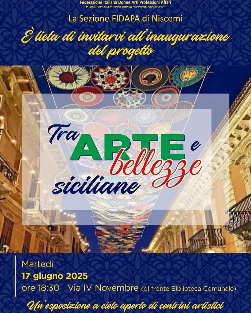 La Sezione FIDAPA di Niscemi ha fissato l' inaugurazione del progetto "Tra arte e bellezze siciliane" per martedì 17 giugno 2025 alle ore 18:30 .