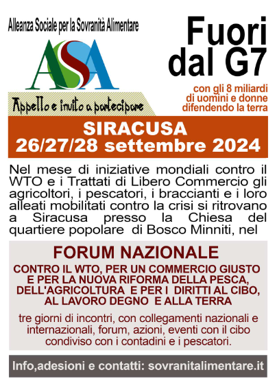 Domani, conferenza stampa di Alleanza Sociale per la Sovranità Alimentare. Saranno presentati i contenuti della tre giorni “Fuori dal G7 con gli 8 miliardi di uomini e donne difendendo la Terra” che si terrà a Siracusa in coincidenza con il G7 Agricoltura. Sarà rilanciato l’appello di Via Campesina internazionale contro gli accordi di libero scambio il WTO e la crisi dell’agricoltura