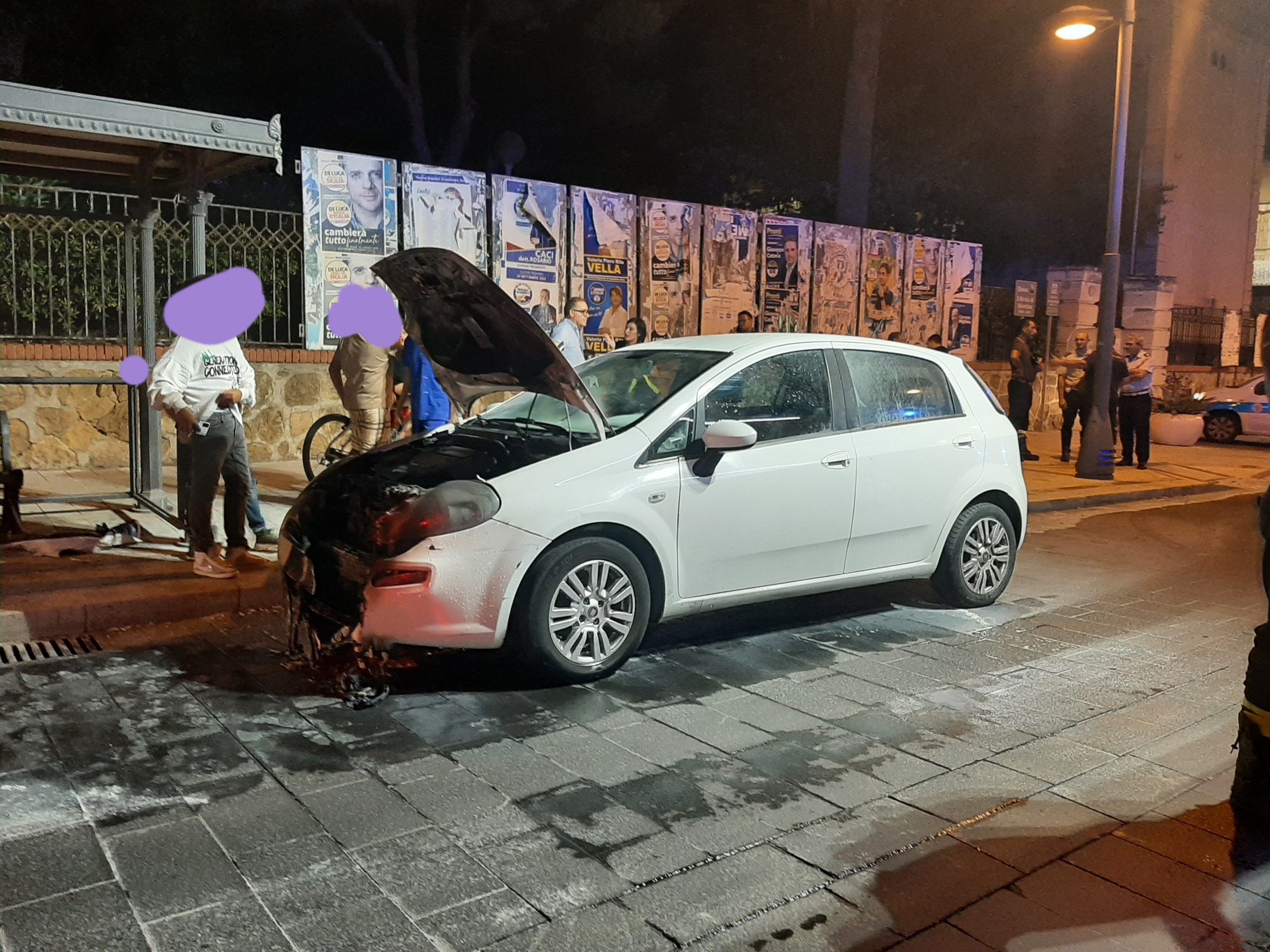 Panico davanti al cimitero di largo San Biagio. Un'auto, una fiatngrande punto, ha preso fuoco mentre camminava, per fortuna , a passo di uomo in quella zona molto trafficata alle 19.30 quando è avven...