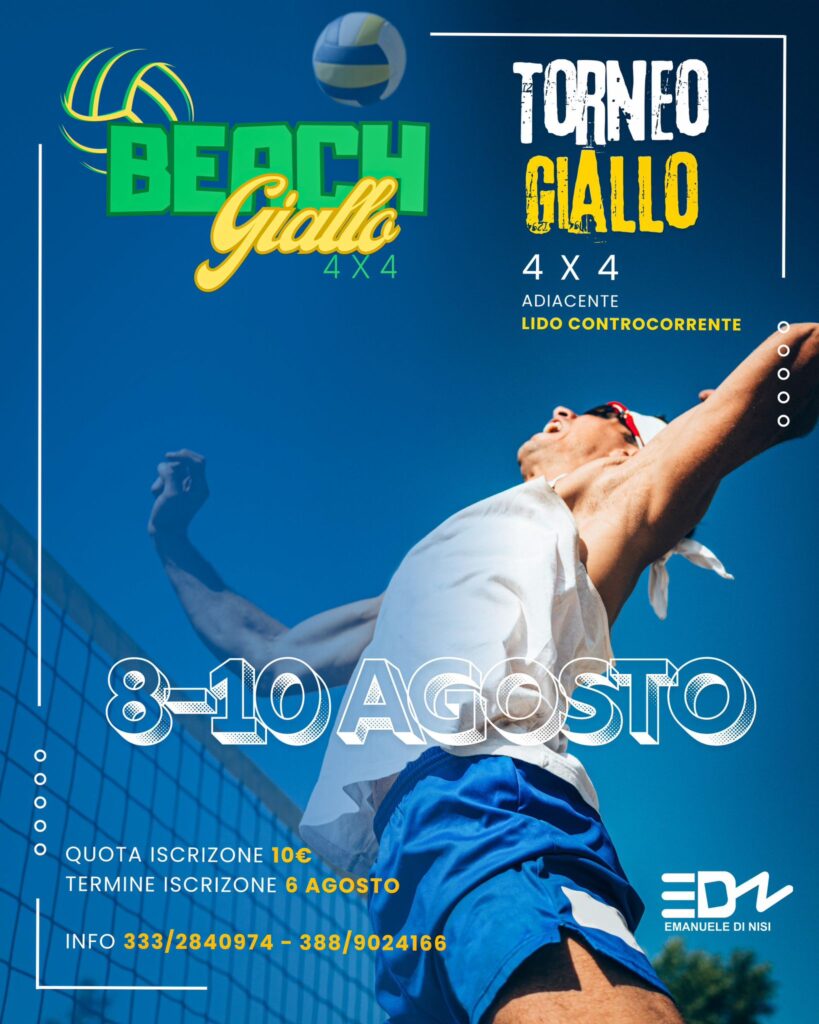 È in programma dall’8 al 10 agosto il torneo Giallo 4x4 di beach volley nell’area adiacente il Controcorrente. Il termine ultimo per iscriversi è il 6 agosto. Un’iniziativa che ogni anno viene ripetuta, con l’organizzazione di Massimo Bonaccorso e Daniele Scicolone da sempre appassionati di beach volley e promotori dell’evento.