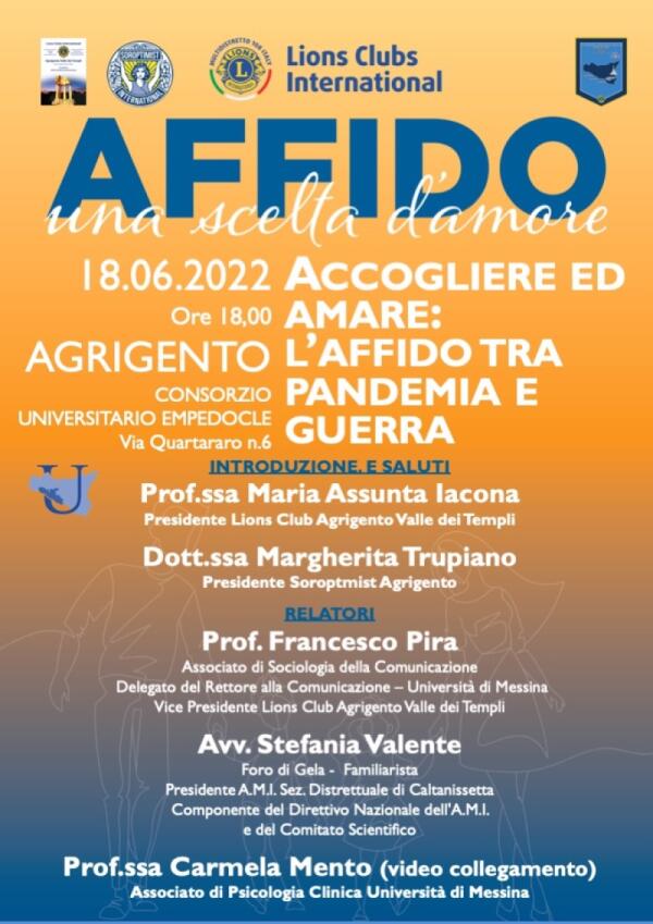 Lions Club Valle dei Templi e Soroptimist, sabato pomeriggio il convegno sull’Affido tra pandemia e guerra: relatrice l'avv. Valente