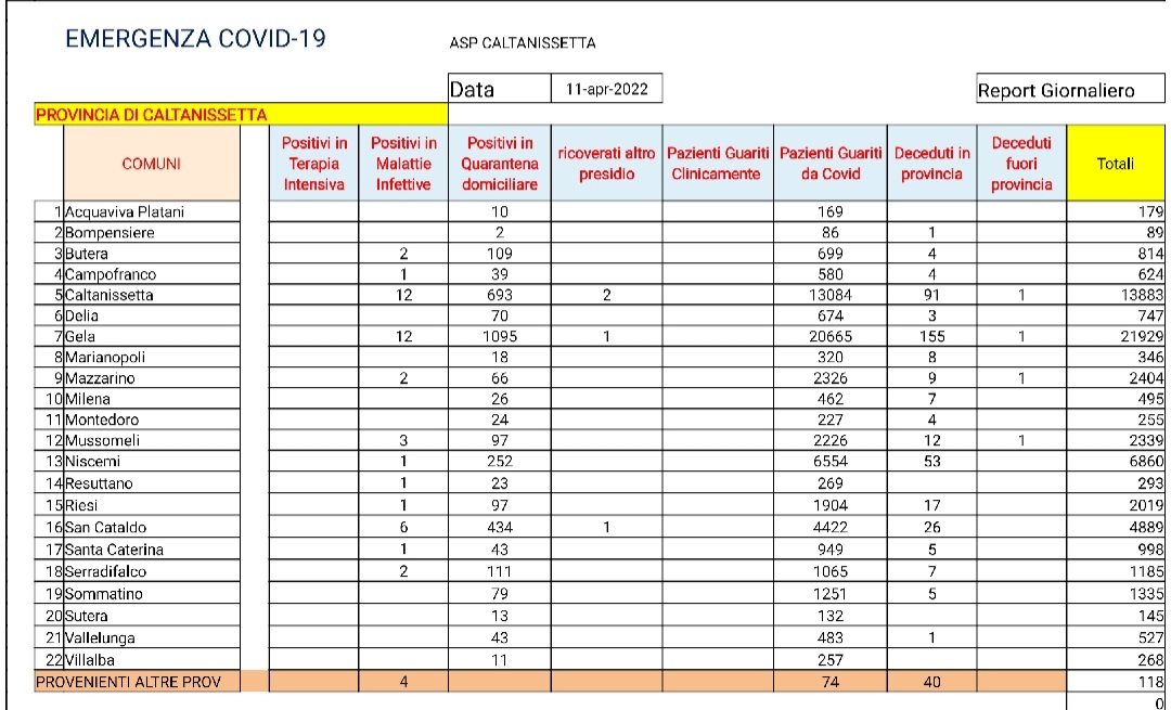 Caltanissetta- A Gela il numero dei contagiati scende 1108. Nelle ultime 24 ore riscontro di 265 pazienti positivi al SARS CoV-2, tutti in isolamento domiciliare: 84 pazienti di Gela, 71 di Caltanissetta, 34 di San Cataldo, 26 di Niscemi, 9 di Serradifalco, 7 di Riesi, 6 di Santa Caterina Villarmosa, 4 di Sommatino, 4 di Vallelunga Pratameno, 4 di Delia, 2 di Butera, 2 di Marianopoli, 2 di Milena, 2 di Montedoro, 2 di Mussomeli, 2 di Resuttano, 2 di Villalba, 1 di Campofranco e 1 di Mazzarino. Ricoverato in degenza ordinaria 1 paziente di Mussomeli. Dimessi dalla degenza ordinaria: 2 pazienti di Caltanissetta, 1 di San Cataldo e 1 di Gela. Guariti da Covid-19: 161 pazienti di Gela, 120 di Caltanissetta, 83 di San Cataldo, 34 di Mussomeli, 27 di Niscemi, 25 di Butera, 19 di Riesi, 14 di Serradifalco, 13 di Sommatino, 12 di Delia, 11 di Santa Caterina Villarmosa, 6 di Campofranco, 4 di Villalba, 3 di Acquaviva Platani, 3 di Milena, 2 di Montedoro, 2 di Resuttano, 1 di Bompensiere, 1 di Mazzarino e 1 di Sutera.