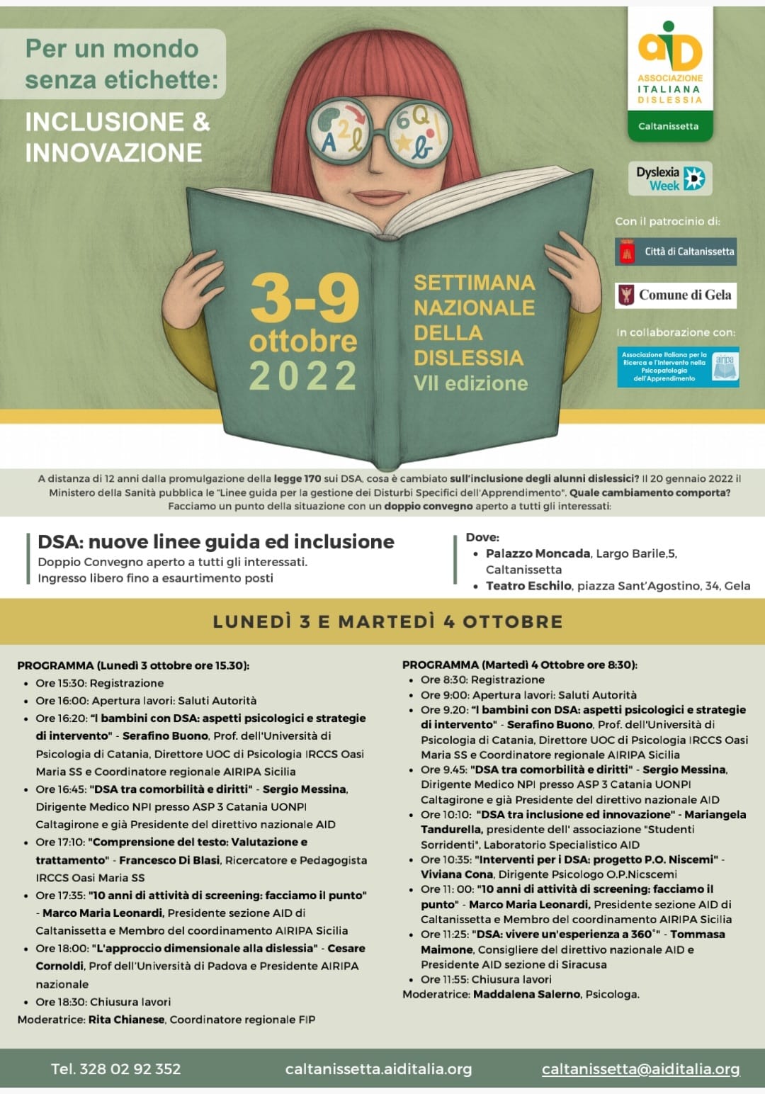 L’incontro dal titolo “DSA: nuove linee guida ed inclusione” è realizzato in collaborazione con AIRIPA Sicilia e patrocinato dai Comuni di Caltanissetta e Gela. Il convegno è stato aperto a tutti gli interessati e si è tenuto lunedì 3 ottobre alle ore 15.30 a Palazzo Moncada, Largo Barile 5 a Caltanissetta e martedì 4 Ottobre, ore 8:30 presso il Teatro Eschilo, piazza Sant’Agostino, 34, a Gela.