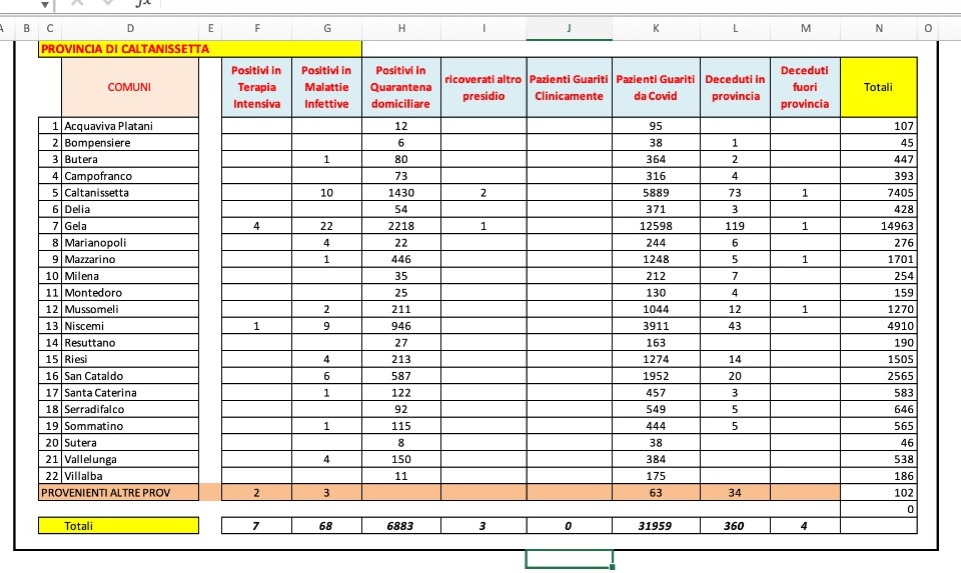 Caltanissetta: Drastico calo dei contagi. Ieri si sono attestati a 2245. Nelle ultime 24 ore riscontro di 472 pazienti positivi al SARS CoV-2, tutti in isolamento domiciliare: 139 pazienti di Caltanissetta, 119 di Gela, 66 di Niscemi, 50 di San Cataldo, 16 di Mazzarino, 16 di Mussomeli, 13 di Santa Caterina Villarmosa, 7 di Campofranco, 7 di Riesi, 6 di Delia, 5 di Acquaviva Platani, 5 di Butera, 5 di Serradifalco, 4 di Vallelunga Pratameno, 3 di Montedoro, 3 di Resuttano, 3 di Sommatino, 2 di Bompensiere, 1 di Marianopoli, 1 di Milena e 1 di Sutera. Ricoverati in degenza ordinaria 5 pazienti di Gela. Dimessi dalla degenza ordinaria: 4 pazienti di Gela e 1 di Caltanissetta. Deceduto 1 paziente di Gela positivo al SARS CoV-2. Guariti: 1127 pazienti di Gela, 265 di Caltanissetta, 164 di Mazzarino, 151 di Vallelunga Pratameno, 133 di San Cataldo, 114 di Niscemi, 80 di Riesi, 59 di Sommatino, 43 di Delia, 36 di Mussomeli, 28 di Campofranco, 26 di Serradifalco, 20 di Santa Caterina Villarmosa, 18 di Marianopoli, 17 di Milena, 12 di Butera, 9 di Montedoro, 8 di Villalba, 6 di Sutera e 1 di Acquaviva Platani.