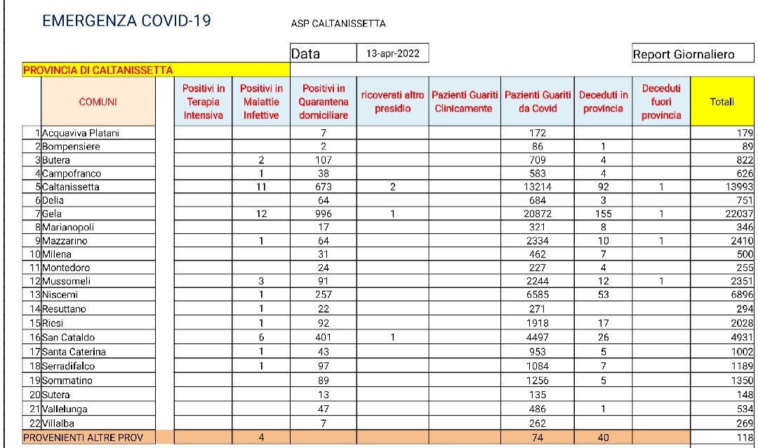 Caltanissetta: A Gela il numero dei contagiati è di 1009. Nelle ultime 24 ore riscontro di 184 pazienti positivi al SARS CoV-2, tutti in isolamento domiciliare: 60 pazienti di Caltanissetta, 48 di Gela, 18 di San Cataldo, 15 di Niscemi, 8 di Sommatino, 6 di Butera, 6 di Riesi, 5 di Mussomeli, 3 di Delia, 3 di Milena, 3 di Vallelunga Pratameno, 2 di Mazzarino, 2 di Santa Caterina Villarmosa, 2 di Serradifalco, 2 di Sutera e 1 di Villalba. Ricoverati in degenza ordinaria: 3 pazienti di Gela, 1 di San Cataldo e 1 di Caltanissetta. Dimessi dalla degenza ordinaria: 2 pazienti di Gela, 1 di Serradifalco, 1 di Caltanissetta e 1 di San Cataldo. Deceduto 1 paziente di Caltanissetta positivo al SARS CoV-2. Guariti: 113 pazienti di Gela, 71 di Caltanissetta, 35 di San Cataldo, 19 di Niscemi, 11 di Riesi, 9 di Mussomeli, 8 di Serradifalco, 7 di Butera, 4 di Delia, 3 di Acquaviva Platani, 3 di Santa Caterina Villarmosa, 2 di Sommatino, 2 di Sutera, 2 di Villalba, 1 di Campofranco, 1 di Marianopoli, 1 di Resuttano e 1 di Vallelunga Pratameno.