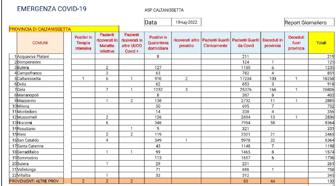 Caltanissetta: Il numero dei positivi di Gela arriva a 1262. Nelle ultime 24 ore riscontro di 169 pazienti positivi al SARS CoV-2, tutti in isolamento domiciliare: 50 pazienti di Gela, 45 di Caltanissetta, 20 di Niscemi, 15 di Butera, 9 di San Cataldo, 8 di Mazzarino, 7 di Riesi, 5 di Mussomeli, 4 di Milena, 3 di Montedoro, 2 di Santa Caterina Villarmosa e 1 di Sutera. Ricoverati in degenza ordinaria: 1 paziente di Riesi e 1 di Butera. Ricoverato presso la UOC Anestesia e Rianimazione 1 paziente proveniente da fuori provincia. Dimesso dalla degenza ordinaria 1 paziente di Gela. Guariti da Covid-19: 43 pazienti di Caltanissetta, 15 di Gela, 10 di Niscemi, 6 di Mussomeli, 5 di San Cataldo, 3 di Sommatino, 2 di Butera, 2 di Vallelunga Pratameno e 1 di Serradifalco.