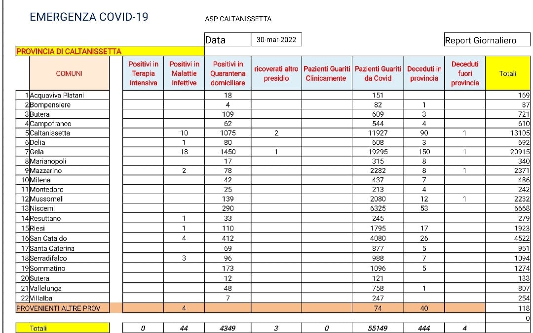 Caltanissetta - A Gela i positivi sono 1469. Nelle ultime 24 ore riscontro di 241 pazienti positivi al SARS CoV-2, tutti in isolamento domiciliare: 64 pazienti di Caltanissetta, 61 di Gela, 41 di San Cataldo, 20 di Niscemi, 11 di Serradifalco, 11 di Sommatino, 6 di Butera, 6 di Mussomeli, 3 di Acquaviva Platani, 3 di Delia, 3 di Mazzarino, 3 di Riesi, 3 di Santa Caterina Villarmosa, 2 di Campofranco, 2 di Sutera, 1 di Milena e 1 di Montedoro. Ricoverati in degenza ordinaria: 2 pazienti di Gela e 1 di San Cataldo. Guariti da Covid-19: 117 pazienti di Caltanissetta, 86 di Gela, 16 di Niscemi, 14 di Mussomeli, 13 di Riesi, 10 di San Cataldo, 10 di Sommatino, 5 di Butera, 4 di Delia, 4 di Santa Caterina Villarmosa, 3 di Mazzarino, 2 di Milena, 2 di Montedoro, 2 di Resuttano, 2 di Serradifalco, 2 di Vallelunga Pratameno e 1 di Campofranco.