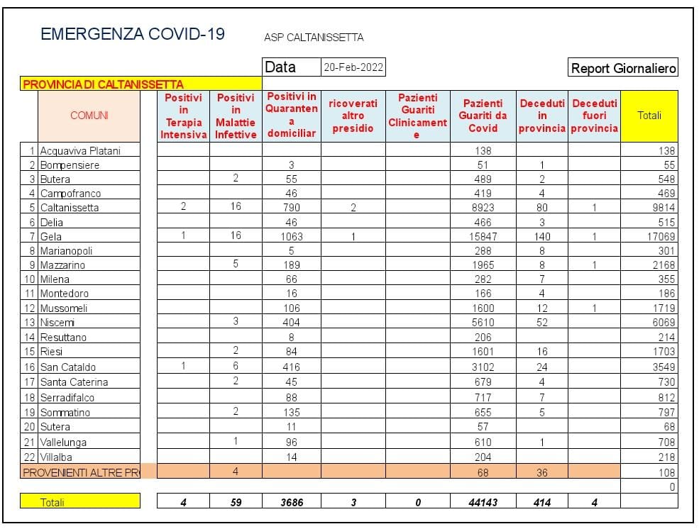 Caltanissetta: Risale leggermente la curva del coronavirus a Gela. Ieri i positivi erano 1081. Nelle ultime 24 ore riscontro di 332 pazienti positivi al SARS CoV-2, tutti in isolamento domiciliare: 100 pazienti di Gela, 67 di Caltanissetta, 50 di San Cataldo, 20 di Mazzarino, 20 di Niscemi, 14 di Sommatino, 12 di Vallelunga Pratameno, 9 di Milena, 9 di Mussomeli, 9 di Serradifalco, 8 di Campofranco, 6 di Riesi, 3 di Santa Caterina Villarmosa, 2 di Butera, 1 di Montedoro, 1 di Sutera e 1 di Villalba. Ricoverati in degenza ordinaria: 1 paziente di Caltanissetta, 1 di Gela e 1 di Riesi. Dimessi dalla degenza ordinaria: 1 paziente di Niscemi e 1 di Mazzarino. Deceduti 6 pazienti positivi al SARS CoV-2: 2 di Caltanissetta, 2 di Gela, 1 di San Cataldo e 1 di Niscemi. Guariti: 63 pazienti di Caltanissetta, 34 di Gela, 17 di Niscemi, 15 di Mussomeli, 9 di San Cataldo, 3 di Delia, 3 di Santa Caterina Villarmosa, 2 di Sommatino, 1 di Campofranco e 1 di Serradiafalco.