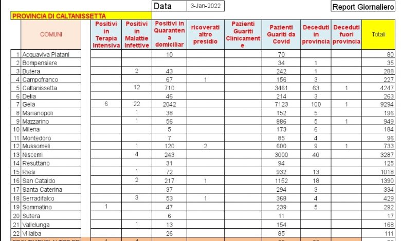 Caltanissetta: Non c'è tregua in tema di coronavirus. A Gela si superano i 2000 contagi. Ieri si è raggiunto il numero di 2070 casi con 6 pazienti in terapia intensiva. Nella ultime 24 ore riscontro di 604 pazienti positivi al SARS CoV-2, tutti in isolamento domiciliare: 415 pazienti di Gela, 60 di Niscemi, 31 di Caltanissetta, 29 di Mussomeli, 17 di Mazzarino, 12 di Riesi, 10 di Butera, 8 di Sommatino, 7 di Campofranco, 7 di San Cataldo, 6 di Serradifalco, 1 di Sutera e 1 di Delia. Ricoverati in degenza ordinaria: 5 pazienti di Gela, 2 di Caltanissetta e 1 di Serradifalco. Dimessi dalla degenza ordinaria: 3 pazienti di Gela, 1 di Vallelunga Pratameno e 1 di Sommatino. Trasferiti dalla degenza ordinaria alla UOC Anestesia e Rianimazione 2 pazienti di Gela. Deceduti 3 pazienti positivi al SARS CoV-2: 1 di Marianopoli, 1 di Santa Caterina Villarmosa e 1 proveniente da fuori provincia. Guariti: 34 pazienti di Gela, 15 di Caltanissetta, 9 di Delia, 9 di San Cataldo, 7 di Niscemi, 5 di Butera, 3 di Santa Caterina Villarmosa, 3 di Serradifalco, 3 di Sommatino, 2 di Mussomeli, 2 di Vallelunga Pratameno, 1 di Marianopoli, 1 di Villalba, 1 di Riesi e 1 di Resuttano.