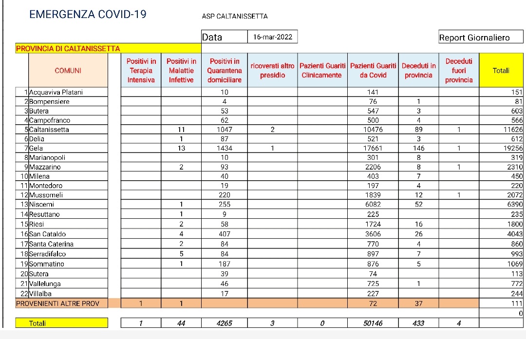 Caltanissetta- Nelle ultime 24 ore riscontro di 432 pazienti positivi al SARS CoV-2, tutti in isolamento domiciliare: 167 pazienti di Gela, 116 di Caltanissetta, 25 di Sommatino, 22 di San Cataldo, 16 di Mussomeli, 16 di Niscemi, 13 di Santa Caterina Villarmosa, 12 di Delia, 10 di Campofranco, 7 di Butera, 6 di Riesi, 4 di Mazzarino, 4 di Milena, 4 di Serradifalco, 4 di Vallelunga Pratameno, 3 di Montedoro, 2 di Sutera e 1 di Marianopoli. Ricoverati in degenza ordinaria: 2 pazienti di Gela, 1 di Riesi e 1 proveniente da fuori provincia. Trasferito dalla UOC Anestesia e Rianimazione alla UOC Malattie Infettive 1 paziente di Caltanissetta. Dimesso dalla degenza ordinaria 1 paziente di Mazzarino. Deceduto 1 paziente di Gela positivo al SARS CoV-2. Guariti: 44 pazienti di Caltanissetta, 19 di Gela, 4 di Sommatino, 3 di Santa Caterina Villarmosa, 2 di Mazzarino, 2 di Mussomeli, 2 di Riesi, 1 di Milena, 1 di Niscemi, 1 di Resuttano, 1 di San Cataldo, 1 di Serradifalco e 1 di Villalba.