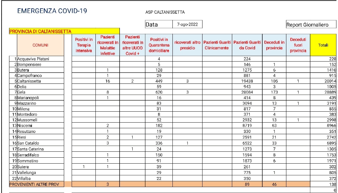 Caltanissetta- Scende a 632 il numero dei positivi di Gela. Nelle ultime 24 ore riscontro di 39 pazienti positivi al SARS CoV-2, tutti in isolamento domiciliare: 16 pazienti di Gela, 11 di Caltanissetta, 3 di Butera, 2 di Niscemi, 2 di Riesi, 2 di Sommatino, 1 di Campofranco, 1 di San Cataldo e 1 di Serradifalco. Ricoverati in degenza ordinaria: 1 paziente di Caltanissetta, 1 di Gela e 1 di Marianopoli. Ricoverato presso la UOC Anestesia e Rianimazione 1 paziente di Sutera. Guariti da Covid-19: 84 pazienti di San Cataldo, 47 di Gela, 32 di Caltanissetta, 30 di Serradifalco, 20 di Butera, 12 di Vallelunga Pratameno, 9 di Campofranco, 7 di Sutera, 7 di Villalba, 4 di Mazzarino, 4 di Riesi, 4 di Mussomeli, 3 di Niscemi, 2 di Delia, 2 di Milena, 2 di Resuttano, 2 di Sommatino, 1 di Bompensiere e 1 di Montedoro.