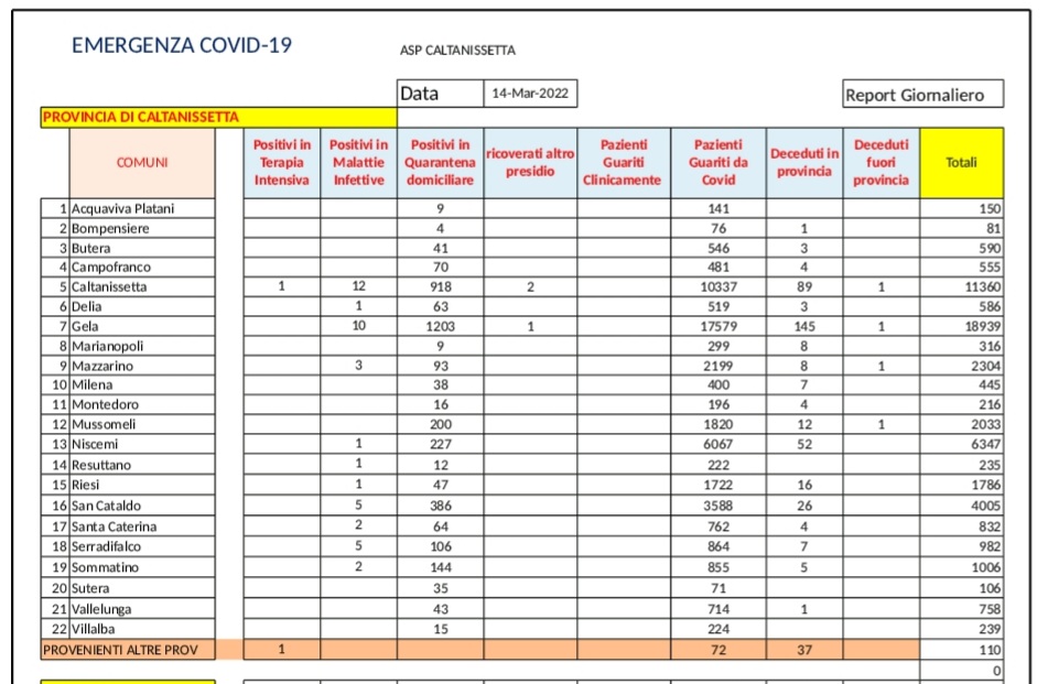 CALTANISSETTA - Il coronavirus di nuovo scatenato. A Gela adesso i casi sono 1214, quasi 400 in più di due settimane fa. Nelle ultime 24 ore riscontro di 768 pazienti positivi al SARS CoV-2, tutti in isolamento domiciliare: 297 pazienti di Gela, 205 di Caltanissetta, 58 di San Cataldo, 47 di Sommatino, 31 di Mussomeli, 25 di Niscemi, 18 di Serradifalco, 12 di Delia, 11 di Mazzarino, 9 di Riesi, 9 di Campofranco, 8 di Santa Caterina Villarmosa, 7 di Butera, 7 di Sutera, 6 di Milena, 6 di Resuttano, 3 di Acquaviva Platani, 3 di Vallelunga Pratameno, 3 di Villalba, 2 di Montedoro e 1 di Marianopoli. Ricoverato in degenza ordinaria 1 paziente di Serradifalco. Guariti da Covid-19: 143 pazienti di Gela, 94 di Caltanissetta, 55 di San Cataldo, 21 di Mussomeli, 19 di Mazzarino, 18 di Serradifalco, 15 di Niscemi, 15 di Resuttano, 12 di Sommatino, 11 di Riesi, 10 di Santa Caterina Villarmosa, 7 di Milena, 5 di Bompensiere, 5 di Butera, 4 di Campofranco, 4 di Vallelunga Pratameno, 3 di Montedoro, 2 di Marianopoli, 1 di Acquaviva Platani, 1 di Delia e 2 di Villalba.