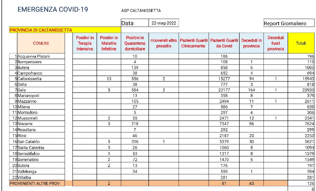 Caltanissetta: A Gela il numero complessivo dei contagiati scende a 591. Nelle ultime 24 ore riscontro di 80 pazienti positivi al SARS CoV-2, tutti in isolamento domiciliare: 33 pazienti di Caltanissetta, 14 di Gela, 11 di Mazzarino, 5 di San Cataldo, 4 di Niscemi, 4 di Riesi, 3 di Sutera, 3 di Mussomeli, 1 di Marianopoli, 1 di Santa Caterina Villarmosa e 1 di Vallelunga Pratameno. Deceduti 2 pazienti positivi al SARS CoV-2: 1 di Niscemi e 1 di Gela. Guariti da Covid-19: 40 pazienti di Caltanissetta, 34 di Gela, 18 di Niscemi, 10 di San Cataldo, 7 di Mazzarino, 5 di Marianopoli, 5 di Butera, 3 di Serradifalco, 2 di Delia, 2 di Mussomeli, 2 di Santa Caterina Villarmosa, 2 di Vallelunga Pratameno, 1 di Campofranco, 1 di Riesi e 1 di Sutera.
