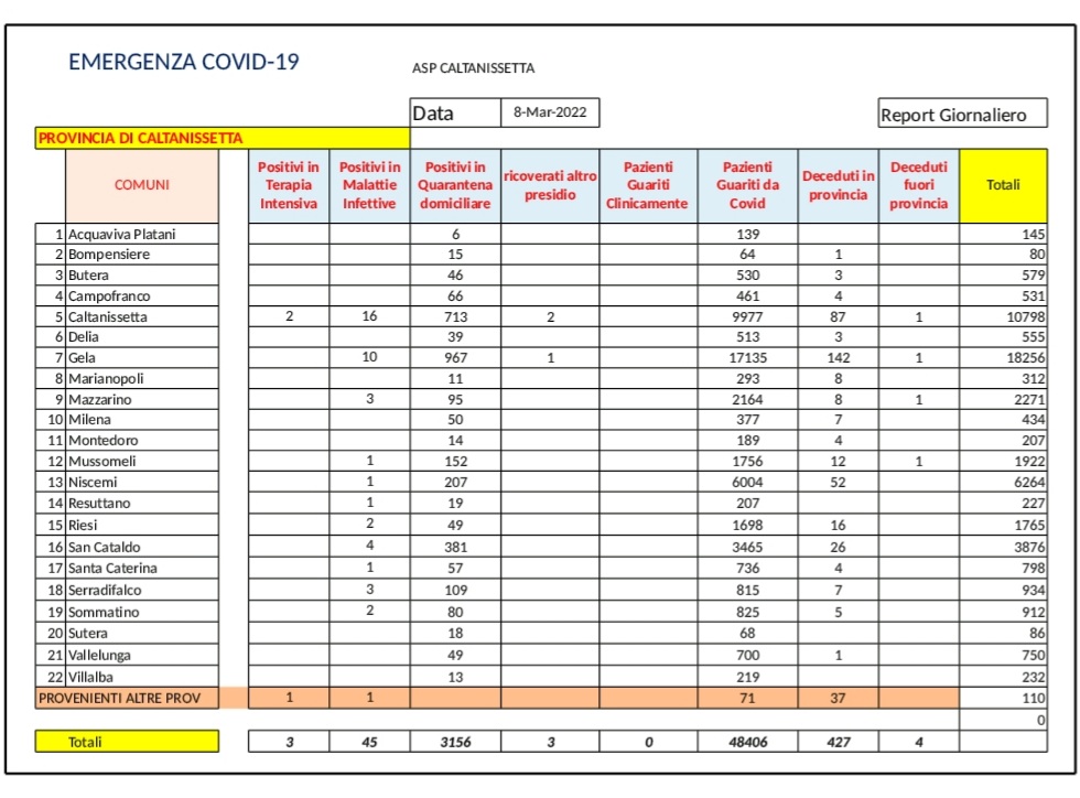 Caltanissetta-Nelle ultime 24 ore riscontro di 469 pazienti positivi al SARS CoV-2, tutti in isolamento domiciliare: 154 pazienti di Gela, 129 di Caltanissetta, 33 di San Cataldo, 29 di Mussomeli, 16 di Sommatino, 16 di Mazzarino, 13 di Santa Caterina Villarmosa, 13 di Niscemi, 11 di Serradifalco, 9 di Butera, 9 di Campofranco, 8 di Delia, 7 di Vallelunga Pratameno, 6 di Sutera, 5 di Riesi, 3 di Milena, 3 di Villalba, 2 di Acquaviva Platani, 2 di Marianopoli e 1 di Montedoro. Ricoverato in degenza ordinaria 1 paziente di Serradifalco. Dimessi dalla degenza ordinaria 2 pazienti: 1 di Niscemi e 1 di Gela, guariti virologicamente. Deceduto 1 paziente di Caltanissetta, positivo al SARS CoV-2. Guariti: 69 pazienti di Gela, 55 di Caltanissetta, 21 di Serradifalco, 11 di Mussomeli, 4 di Delia, 4 di Niscemi, 4 di San Cataldo, 4 di Sommatino, 3 di Bompensiere, 3 di Butera, 3 di Mazzarino, 3 di Vallelunga Pratameno, 3 di Santa Caterina Villarmosa, 1 di Campofranco, 1 di Marianopoli e 1 di Montedoro.