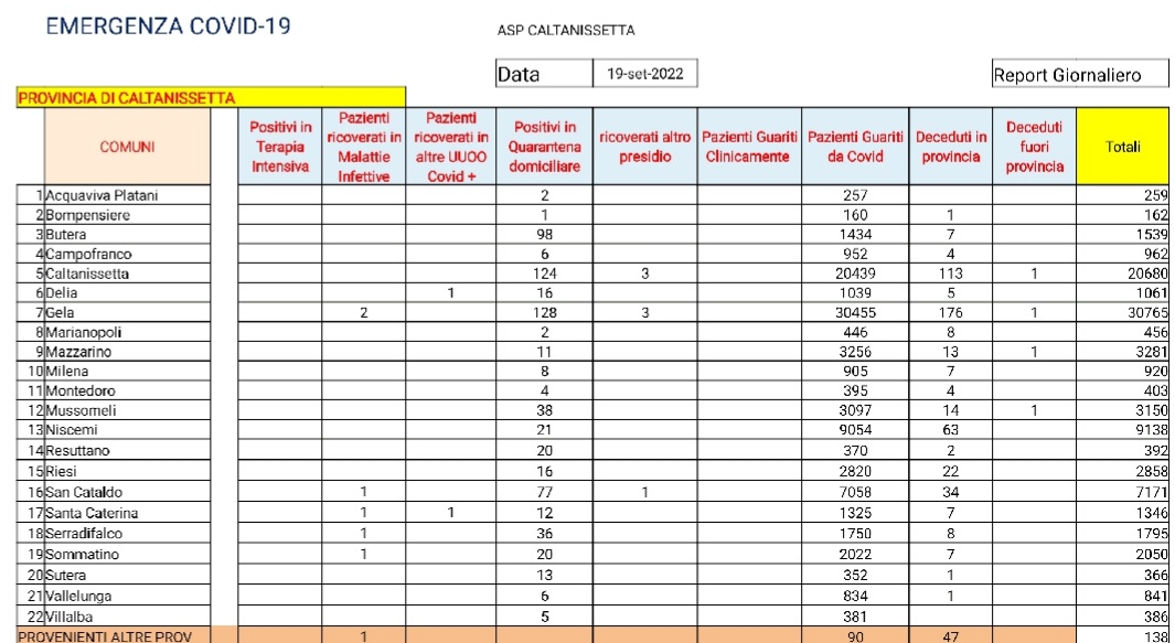 Nelle ultime 24 ore riscontro di 51 pazienti positivi al SARS CoV-2, tutti in isolamento domiciliare: 16 pazienti di Gela, 15 di Caltanissetta, 9 di San Cataldo, 3 di Sommatino, 2 di Villalba, 2 di Mazzarino, 1 di Butera, 1 di Milena, 1 di Mussomeli e 1 di Riesi. Nessuna variazione sui ricoveri ordinari.