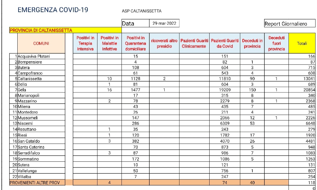 Caltanissetta-Il dato di Gela scende sotto i 1500 casi. Nelle ultime 24 ore riscontro di 527 pazienti positivi al SARS CoV-2, tutti in isolamento domiciliare: 166 pazienti di Gela, 141 di Caltanissetta, 64 di San Cataldo, 24 di Mussomeli, 23 di Niscemi, 16 di Serradifalco, 16 di Riesi, 15 di Santa Caterina Villarmosa, 15 di Sommatino, 10 di Delia, 9 di Mazzarino, 6 di Resuttano, 4 di Villalba, 3 di Butera, 3 di Milena, 3 di Sutera, 2 di Acquaviva Platani, 2 di Campofranco, 2 di Marianopoli, 2 di Montedoro e 1 di Vallelunga Pratameno. Ricoverati in degenza ordinaria: 2 pazienti di Caltanissetta, 1 di Serradifalco, 1 di Gela e 1 proveniente da fuori provincia. Dimessi dalla degenza ordinaria: 2 pazienti di Caltanissetta, 1 di San Cataldo e 1 proveniente da fuori provincia. Deceduto 1 paziente positivo al SARS CoV-2 proveniente da fuori provincia. Guariti: 189 pazienti di Gela, 110 di Caltanissetta, 33 di Sommatino, 30 di San Cataldo, 24 di Niscemi, 18 di Mussomeli, 14 di Riesi, 12 di Santa Caterina Villarmosa, 11 di Mazzarino, 9 di Delia, 6 di Butera, 6 di Vallelunga Pratameno, 4 di Milena, 4 di Serradifalco, 1 di Acquaviva Platani, 1 di Bompensiere, 1 di Marianopoli e 1 di Montedoro.