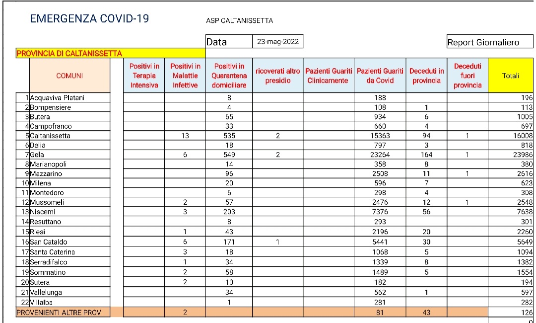 Caltanissetta - A Gela il numero complessivo dei casi di positività al Covid si attesta a 557. Nelle ultime 24 ore riscontro di 204 pazienti positivi al SARS CoV-2, tutti in isolamento domiciliare: 65 pazienti di Caltanissetta, 52 di Gela, 27 di San Cataldo, 14 di Niscemi, 7 di Mussomeli, 6 di Riesi, 5 di Sommatino, 5 di Mazzarino, 3 di Campofranco, 3 di Milena, 3 di Serradifalco, 3 di Sutera, 3 di Vallelunga Pratameno, 2 di Butera, 2 di Montedoro, 2 di Resuttano, 1 di Marianopoli e 1 di Villalba. Ricoverati in degenza ordinaria 4 pazienti: 1 di Caltanissetta, 1 di San Cataldo, 1 di Gela e 1 di Riesi. Dimesso dalla degenza ordinaria 1 paziente di Caltanissetta. Guariti da Covid-19: 87 pazienti di Gela, 86 di Caltanissetta, 76 di Butera, 62 di San Cataldo, 29 di Niscemi, 22 di Serradifalco, 20 di Delia, 19 di Sommatino, 14 di Mazzarino, 10 di Milena, 9 di Riesi, 8 di Campofranco, 8 di Santa Caterina Villarmosa, 6 di Sutera, 5 di Mussomeli, 3 di Vallelunga Pratameno, 2 di Acquaviva Platani, 1 di Montedoro e 1 di Resuttano.