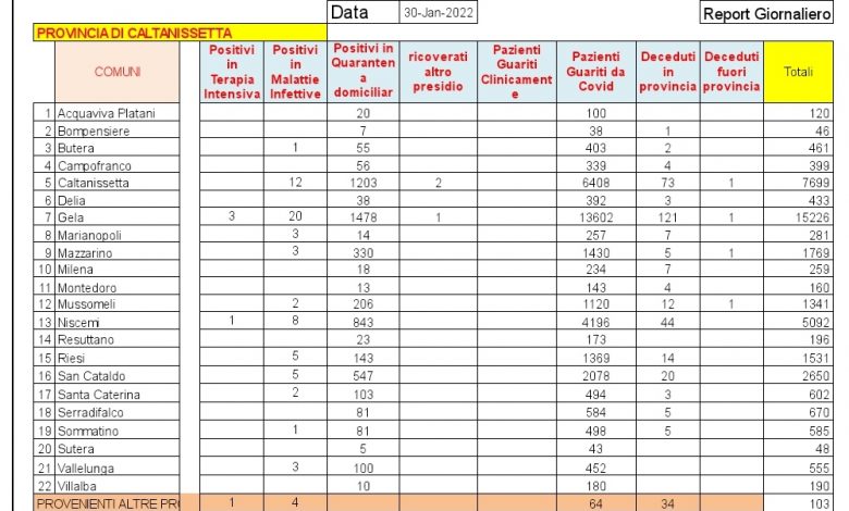 Caltanissetta: Il Coronavirus in discesa. A Gela l'ultimo numero comunicato dalla dirigenza dell'Asp è di 1502. Nelle ultime 24 ore riscontro di 240 pazienti positivi al SARS CoV-2, tutti in isolamento domiciliare: 56 pazienti di Caltanissetta, 50 di Gela, 43 di Niscemi, 31 di Mussomeli, 12 di Mazzarino, 9 di San Cataldo, 8 di Riesi, 8 di Acquaviva Platani, 6 di Vallelunga Pratameno, 4 di Serradifalco, 3 di Milena, 3 di Resuttano, 2 di Santa Caterina Villarmosa, 1 di Campofranco, 1 di Delia, 1 di Marianopoli, 1 di Sommatino e 1 di Sutera. Ricoverati in degenza ordinaria: 2 pazienti di Mazzarino, 1 di Riesi,1 di Niscemi e 1 di Santa Caterina Villarmosa. Dimesso dalla degenza ordinaria 1 paziente di Gela guarito virologicamente. Deceduto 1 paziente di Gela positivo al SARS CoV-2. Guariti: 133 pazienti di Gela, 71 di Caltanissetta, 51 di Niscemi, 26 di Mazzarino, 17 di Mussomeli, 17 di Riesi, 13 di San Cataldo, 8 di Vallelunga Pratameno, 8 di Campofranco, 7 di Butera, 5 di Sommatino, 4 di Serradifalco, 4 di Milena, 3 di Santa Caterina Villarmosa, 1 di Montedoro, 1 di Marianopoli e 1 di Delia.