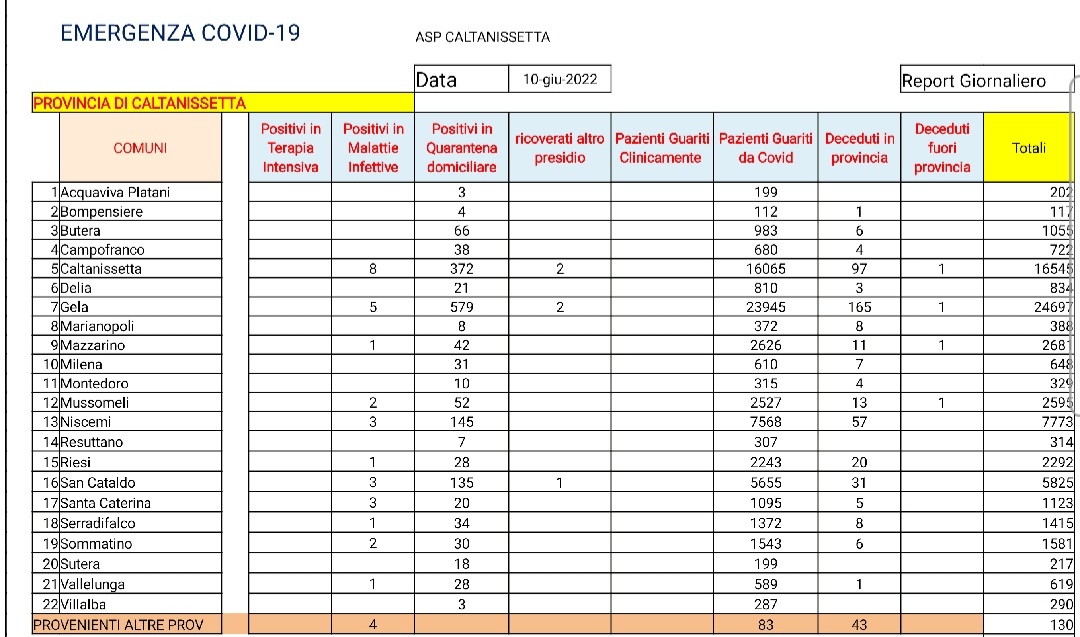 Caltanissetta- Da 499 di una settimana fa a 586 un bel salto nel numero complessivo sei positivi di Gela elle ultime 24 ore riscontro di 135 pazienti positivi al SARS CoV-2, tutti in isolamento domiciliare: 53 pazienti di Gela, 41 di Caltanissetta, 11 di Niscemi, 9 di San Cataldo, 5 di Serradifalco, 3 di Mussomeli, 3 di Riesi, 2 di Mazzarino, 2 di Milena, 2 di Santa Caterina Villarmosa, 1 di Butera, 1 di Marianopoli, 1 di Vallelunga Pratameno e 1 di Villalba. Ricoverati in degenza ordinaria: 1 paziente di San Cataldo e 1 di Santa Caterina Villarmosa. Dimessi dalla degenza ordinaria 2 pazienti di Caltanissetta e 1 di Gela. Deceduto 1 paziente di Caltanissetta positivo al SARS CoV-2. Guariti: 37 pazienti di Gela, 26 di Caltanissetta, 14 di San Cataldo, 8 di Niscemi, 6 di Mazzarino, 4 di Santa Caterina Villarmosa, 3 di Butera, 2 di Campofranco, 2 di Delia, 2 di Milena, 1 di Marianopoli, 1 di Riesi, 1 di Sommatino e 1 di Vallelunga Pratameno.