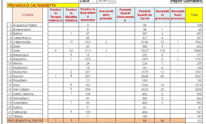 Caltanissetta: Scendono a 1738 i positivi di Gela. Nelle ultime 24 ore riscontro di 552 pazienti positivi al SARS CoV-2, tutti in isolamento domiciliare: 134 pazienti di Caltanissetta, 122 di Gela, 9...