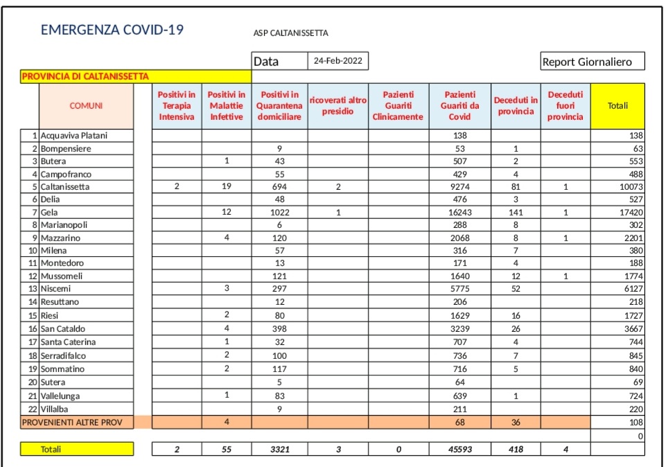 Caltanissetta: Scendono a 1035 i positivi di Gela. Nelle ultime 24 ore riscontro di 205 pazienti positivi al SARS CoV-2, tutti in isolamento domiciliare: 65 pazienti di Gela, 59 di Caltanissetta, 18 di San Cataldo, 10 di Niscemi, 9 di Sommatino, 7 di Mazzarino, 7 di Serradifalco, 6 di Mussomeli, 5 di Campofranco, 5 di Milena, 4 di Riesi, 2 di Bompensiere, 2 di Delia, 2 di Resuttano, 1 di Marianopoli, 1 di Santa Caterina Villarmosa, 1 di Vallelunga Pratameno e 1 di Villalba. Trasferito dalla UOC Anestesia e Rianimazione alla UOC Malattie Infettive 1 paziente di San Cataldo. Dimessi dalla degenza ordinaria: 2 pazienti di Gela e 1 di Santa Caterina Villarmosa. Guariti da Covid-19: 107 pazienti di Gela, 85 di Caltanissetta, 36 di Niscemi, 36 di San Cataldo, 18 di Mazzarino, 16 di Milena, 13 di Sommatino, 10 di Mussomeli, 10 di Santa Caterina Villarmosa, 6 di Vallelunga Pratameno, 4 di Delia, 4 di Serradifalco, 4 di Sutera, 3 di Butera, 2 di Villalba, 1 di Bompensiere, 1 di Campofranco e 1 di Riesi.