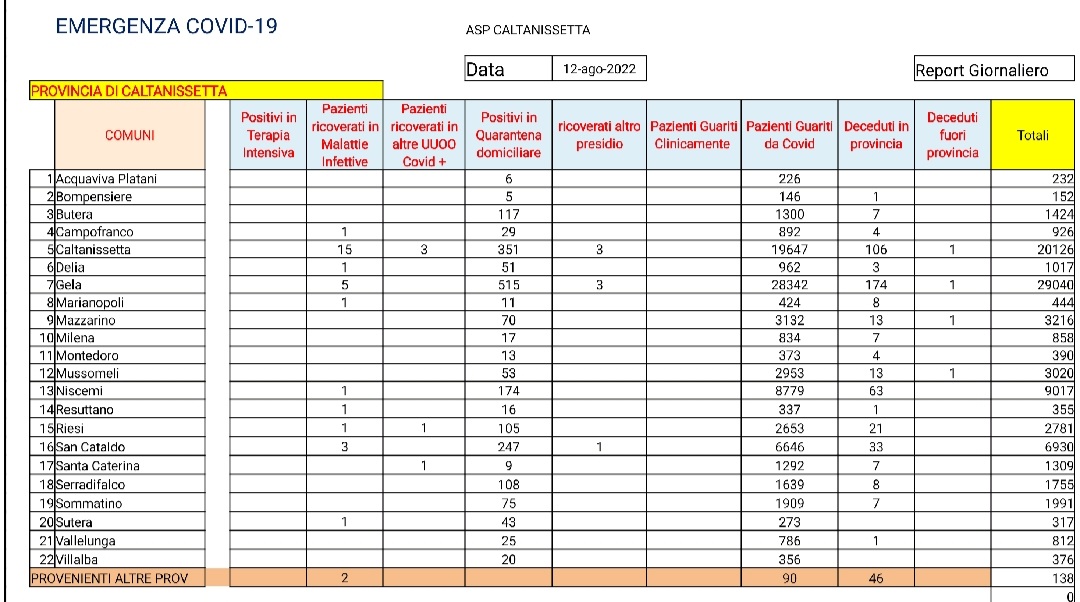 Nella provincia nissena, nelle ultime 24 ore riscontro di 92 pazienti positivi al SARS CoV-2, tutti in isolamento domiciliare: 30 di Gela, 16 di Caltanissetta, 14 di Niscemi, 6 di Riesi, 5 di Montedoro, 3 di Milena, 3 di San Cataldo, 2 di Acquaviva Platani, 2 di Butera, 2 di Sommatino, 2 di Vallelunga Pratameno, 1 di Campofranco, 1 di Mazzarino, 1 di Santa Caterina Villarmosa e 1 di Sutera. Dimessi dalla degenza ordinaria: 1 paziente di Caltanissetta e 1 paziente di San Cataldo. Guariti da Covid-19: 37 pazienti di Caltanissetta, 29 di Gela, 18 di Riesi, 10 di Niscemi, 6 di Mazzarino, 6 di San Cataldo, 4 di Santa Caterina Villarmosa, 3 di Delia, 3 di Milena, 3 di Mussomeli, 2 di Butera, 2 di Sommatino, 2 di Vallelunga Pratameno, 1 di Serradifalco e 1 di Sutera. A Gela ci sono 523 positivi.