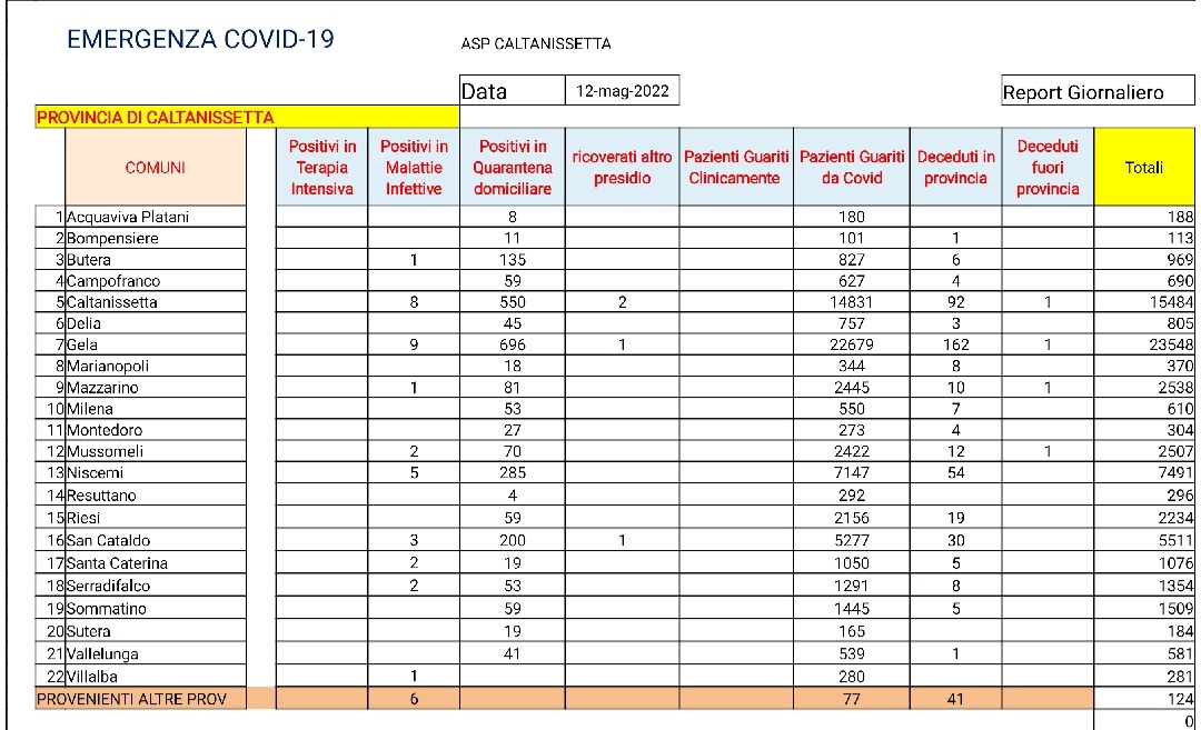 Caltanissetta: A Gela o positivi sono 706.Nelle ultime 24 ore riscontro di 219 pazienti positivi al SARS CoV-2, tutti in isolamento domiciliare: 56 pazienti di Gela, 54 di Caltanissetta, 28 di Niscemi, 22 di San Cataldo, 9 di Mazzarino, 8 di Butera, 6 di Marianopoli, 6 di Mussomeli, 5 di Campofranco, 5 di Serradifalco, 5 di Sommatino, 3 di Acquaviva Platani, 3 di Santa Caterina Villarmosa, 3 di Vallelunga Pratameno, 2 di Milena, 1 di Delia, 1 di Montedoro, 1 di Resuttano e 1 di Riesi. Ricoverati in degenza ordinaria: 1 paziente di Mussomeli e 1 proveniente da fuori provincia. Dimessi dalla degenza ordinaria: 1 paziente di Mazzarino, 1 di Gela, 1 di San Cataldo, 1 di Caltanissetta e 1 proveniente da fuori provincia. Deceduto 1 paziente di Gela positivo al SARS CoV-2. Guariti: 45 pazienti di Gela, 42 di Caltanissetta, 23 di Niscemi, 11 di San Cataldo, 4 di Mazzarino, 4 di Mussomeli, 4 di Serradifalco, 3 di Campofranco, 3 di Sommatino, 2 di Montedoro, 1 di Delia, 1 di Milena, 1 di Santa Caterina Villarmosa e 1 di Sutera.