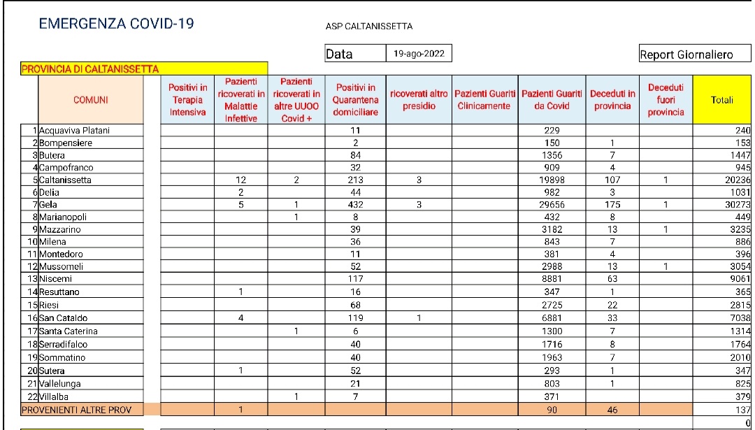 A Gela il numero dei positivi sale a 441. Nelle ultime 24 ore riscontro di 110 pazienti positivi al SARS CoV-2, tutti in isolamento domiciliare: 48 pazienti di Gela, 15 di Caltanissetta, 10 di Niscemi, 6 di Riesi, 5 di San Cataldo, 4 di Butera, 4 di Milena, 4 di Mussomeli, 3 di Delia, 3 di Mazzarino, 3 di Vallelunga Pratameno, 2 di Sommatino, 2 di Villalba e 1 di Serradifalco. Ricoverati in degenza ordinaria: 4 pazienti di Gela, 2 di Caltanissetta e 1 di San Cataldo. Dimessi dalla degenza ordinaria: 2 pazienti di Caltanissetta e 1 di Niscemi. Deceduto 1 paziente di Riesi positivo al SARS CoV-2. Guariti: 31 pazienti di Gela, 15 di Riesi, 10 di Caltanissetta, 10 di Niscemi, 7 di San Cataldo, 4 di Butera, 4 di Mussomeli, 4 di Serradifalco, 3 di Mazzarino, 3 di Sommatino, 3 di Vallelunga Pratameno, 2 di Acquaviva Platani, 2 di Campofranco, 2 di Milena, 2 di Resuttano, 2 di Santa Caterina Villarmosa e 2 di Villalba.