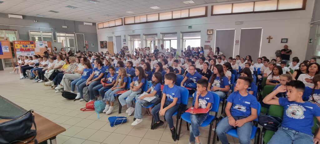 Ospiti della giornata, la dirigente dell’Istituto Comprensivo Pirandello di Comiso, prof.ssa Francesca Lauria e le insegnanti Calafiore e Melfi curatrici del progetto Erasmus “A small choir for a great continent”, con i loro alunni, piccoli coristi di canti internazionali.