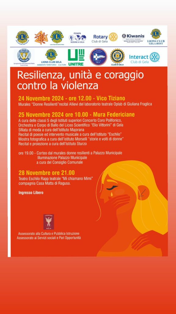 Un omaggio particolare e’ stato proclamato verso Monica Contrafatto, donna gelese simbolo di resilienza, con la lettura di passi tratti dal suo libro . Sono intervenute, oltre agli Assessori, Giuliana Fraglica e Davide Barone, Presidente del Leo Club, in rappresentanza dei Club service della città .