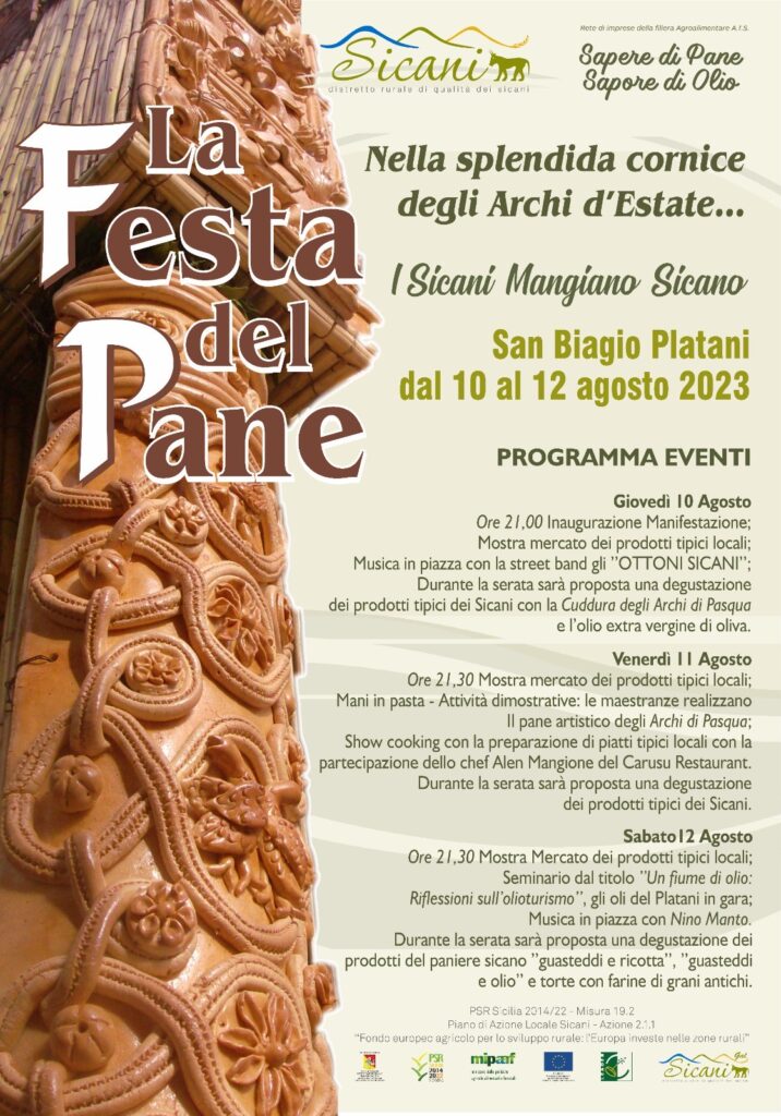 Da giovedì 10 a sabato 12 agosto prossimi, a San Biagio Platani, nella splendida cornice delle architetture effimere degli Archi d’Estate, si svolgerà la Festa del Pane, una vetrina del turismo e dei prodotti agroalimentari dei Sicani.