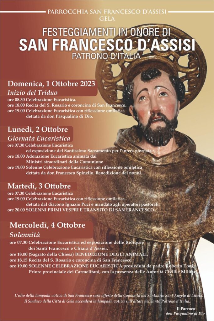 Domani, mercoledì 4 Ottobre: Solennità di San Francesco, alle 07.30 inizierà la Santa Messa e alle ore 18.00, sul sagrato della Chiesa, si svolgerà la tradizionale benedizione degli animali. Alle 19.00 inizierà la solenne Celebrazione Eucaristica con la presenza delle Autorità Civili e Militari presieduta dal Rev.do Padre Roberto Toni, Provinciale dei Carmelitani d’Italia che insieme alla Comunità di Sant’Angelo di Licata offrirà l’olio della lampada che il Sindaco accenderà sull’altare del Santo Patrono d’Italia.