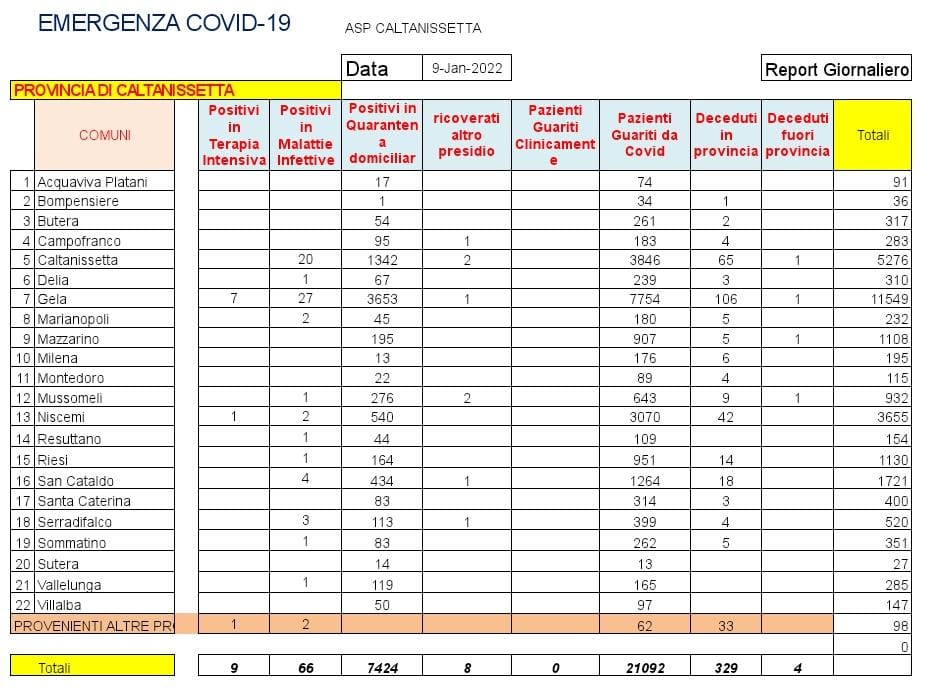 Nelle ultime 24 ore riscontro di 331 pazienti positivi al SARS CoV-2, tutti in isolamento domiciliare: 120 pazienti di Gela, 47 di Caltanissetta, 42 di Vallelunga Pratameno, 37 di Niscemi, 15 di Mussomeli, 15 di San Cataldo, 12 di Mazzarino, 11 di Riesi, 8 di Campofranco, 6 di Serradifalco, 6 di Villalba, 3 di Montedoro, 2 di Sommatino, 2 di Sutera, 2 di Marianopoli, 2 di Milena e 1 di Bompensiere. Ricoverati in degenza ordinaria: 2 pazienti di Caltanissetta, 2 di Gela e 1 di Riesi. Trasferito fuori provincia 1 paziente di Caltanissetta. Dimessi 2 pazienti di Gela, in isolamento domiciliare. Deceduti 2 pazienti positivi al SARS CoV-2: 1 di Gela e1 di Butera. Guariti: 242 pazienti di Gela, 84 di Caltanissetta, 24 di Mussomeli, 15 di San Cataldo, 12 di Serradifalco, 9 di Campofranco, 9 di Niscemi, 5 di Santa Caterina Villarmosa, 5 di Sommatino, 3 di Butera, 3 di Vallelunga Pratameno, 3 di Villalba, 2 di Acquaviva Platani, 2 di Delia, 2 di Marianopoli, 1 di Mazzarino, 1 di Milena e 1 di Resuttano.