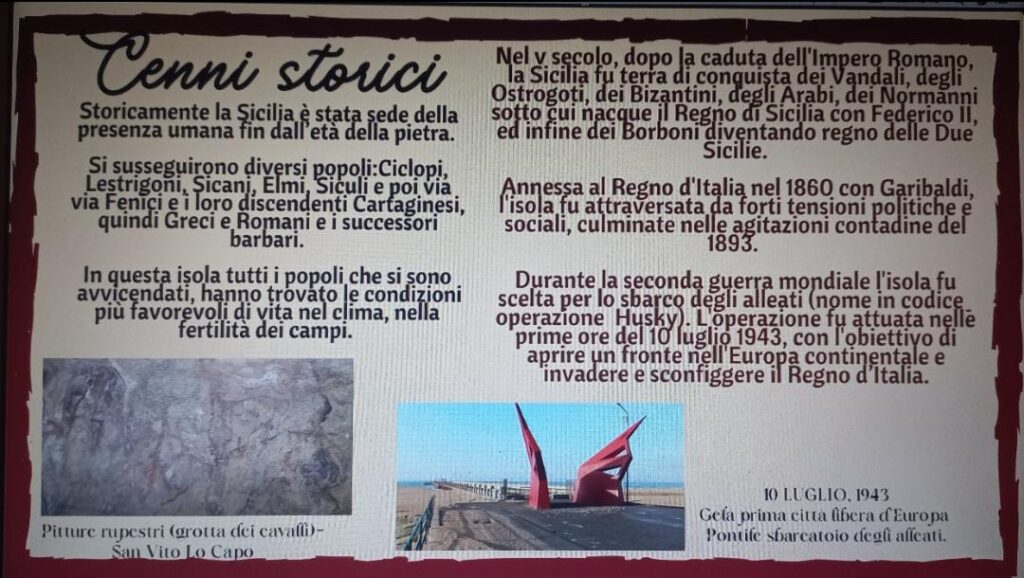 E' Gaia Zarba che l'ha descritta in un power point su input dell'insegnante di italiano che ha richiesto alla classe un lavoro di elementi di realtà, dove si richiedeva di descrivere una regione italiana e gli enti locali, Gaia ha scelto di trattare la Sicilia per la sua ricchezza culturale e storica unica. Ecco cosa ci ha detto alla presenza della sua famiglia.