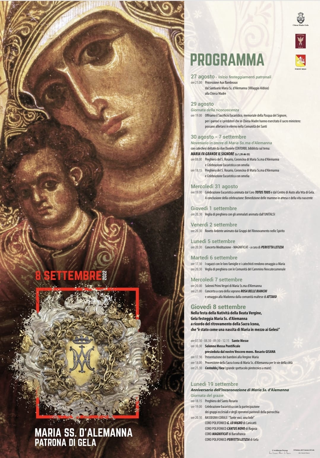 Gela oggi in festa: celebra Maria SS dell'Alemanna, patrona della città, dal 1450 anno del ritrovamento dell'icona in stile bizantino della Madonna. Nel punto in cui fu portata alla luce l'icona della Madonna, in suo onore fu innalzata una chiesa, il Santuario di Maria SS. dell'Alemanna.