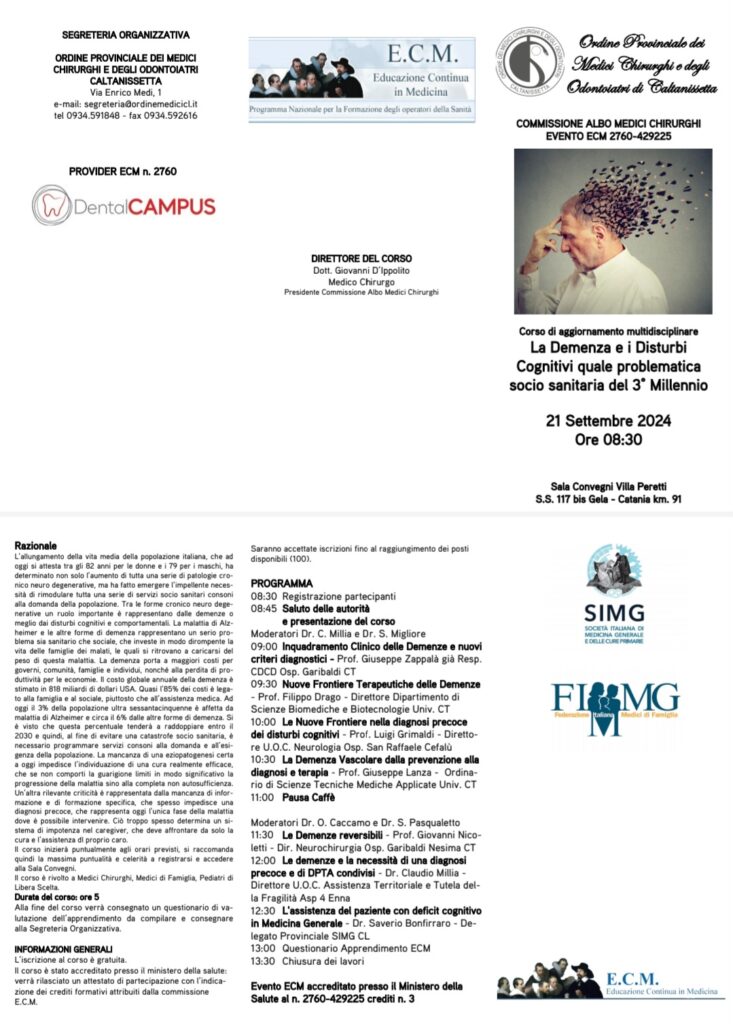 Ecco il Programma: ore 9.00, il Saluto delle Autorità, segue la Sessione mattutina moderata dal Dott. C.Millia e dal dott. S. Migliore. A seguire gli interventi: “Inquadramento Clinico delle Demenze e nuovi criteri diagnostici”, Prof. G. Zappalà, già Resp. CDCD Osp. Garibaldi Ct; “Nuove Frontiere Terapeutiche delle Demenze”, Prof. F. Drago, Direttore Dipartimento di Scienze Biomediche e Biotecnologie, Univ. Catania; “Le Nuove Frontiere nella diagnosi precoce dei disturbi cognitivi”, Prof L. Grimaldi, Direttore U.O.C. Neurologia, Osp.. San Raffaele Cefalù, “La Demenza Vascolare dalla prevenzione alla diagnosi e terapia”, Prof. G. Lanza, Ordinario di Scienze Tecniche Mediche Applicate, Univ. Catania resp. UOR Neurofisiologia Clinica, IRCCS Oasi Maria SS. di Troina. Dopo il Break coffe, alle 11:30 ripresa dei lavori, moderano i Dott. O.A. Caccamo e S. Pasqualetto. “Le Demenze reversibili”, Prof. G. Nicoletti, Direttore Neurochirurgia, Osp. Garibaldi, Nesima Catania; “Le demenze e la necessità di una diagnosi precoce e di DPTA condivisi”, Dr. Claudio Millia, Direttore U.O.C. Assistenza Territoriale e Tutela della Fragilità, Asp 4 Enna; “L'assistenza del paziente con deficit cognitivo in Medicina Generale”, Dott. Saverio Bonfirraro, Delegato Provinciale SIMG Cl.