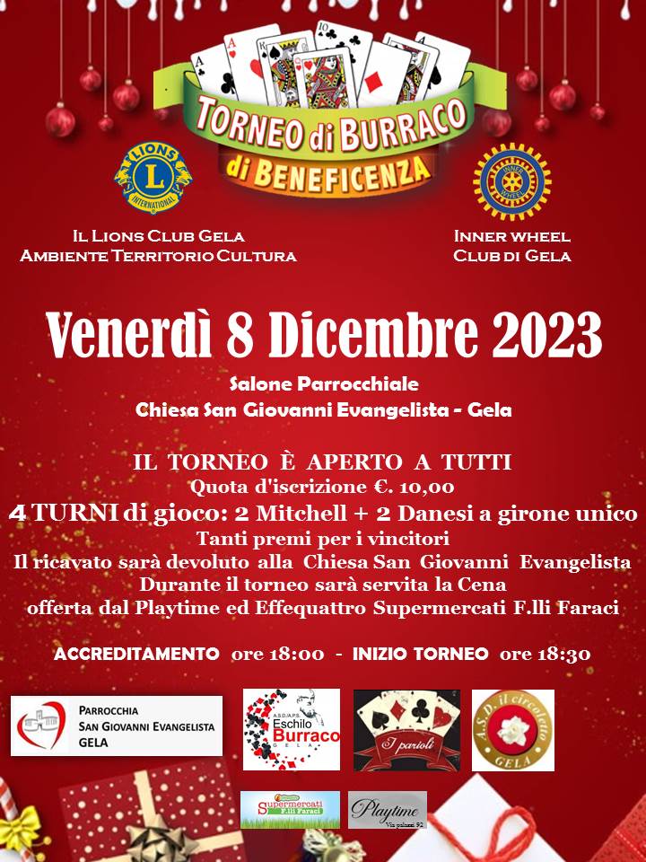 Il torneo di burraco si è svolto nel salone parrocchiale della chiesa di Macchitella: vi hanno partecipato appassionati del gioco da tavolo e rappresentanti dei club service che hanno potuto assaporare una cena offerta da due aziende locali. “in tempo di Natale – hanno commentato le due presidenti Romano e Licata – è bello pensare a chi ha meno degli altri e con questa iniziativa dal sapore natalizio e dai contorni divertenti potremo contribuire a rendere dolci le feste di tanti persone con qualche problema economico in più”.