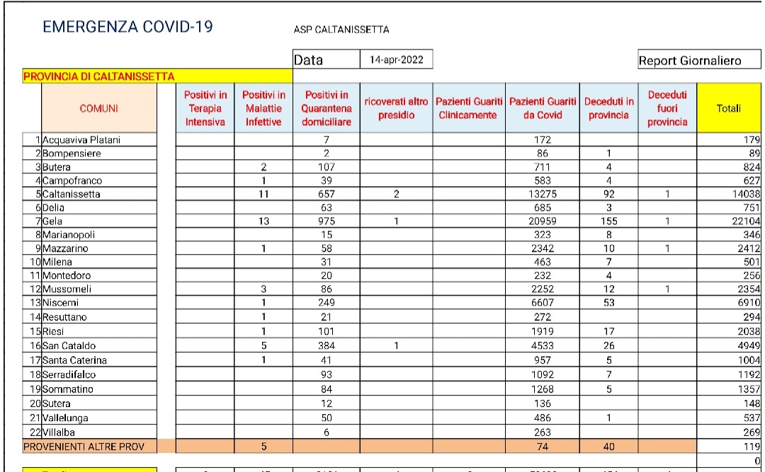 Caltanissetta- Il numero complessivo dei casi di contagio a Gela scende sotto i mille , 989 in tutto. Nelle ultime 24 ore riscontro di 179 pazienti positivi al SARS CoV-2, tutti in isolamento domiciliare: 67 pazienti di Gela, 45 di Caltanissetta, 18 di San Cataldo, 14 di Niscemi, 10 di Riesi, 7 di Sommatino, 3 di Mussomeli, 3 di Serradifalco, 3 di Vallelunga Pratameno, 2 di Butera, 2 di Mazzarino, 2 di Santa Caterina Villarmosa, 1 di Campofranco, 1 di Milena e 1 di Montedoro. Ricoverati in degenza ordinaria: 2 pazienti di Gela e 1 proveniente da fuori provincia. Dimessi dalla degenza ordinaria: 1 paziente di Serradifalco, 1 di San Cataldo e 1 di Gela. Guariti da Covid-19: 86 pazienti di Gela, 61 di Caltanissetta, 35 di San Cataldo, 22 di Niscemi, 12 di Sommatino, 8 di Mazzarino, 8 di Mussomeli, 7 di Serradifalco, 5 di Montedoro, 4 di Santa Caterina Villarmosa, 2 di Butera, 2 di Marianopoli, 1 di Delia, 1 di Milena, 1 di Resuttano, 1 di Riesi, 1 di Sutera e 1 di Villalba.