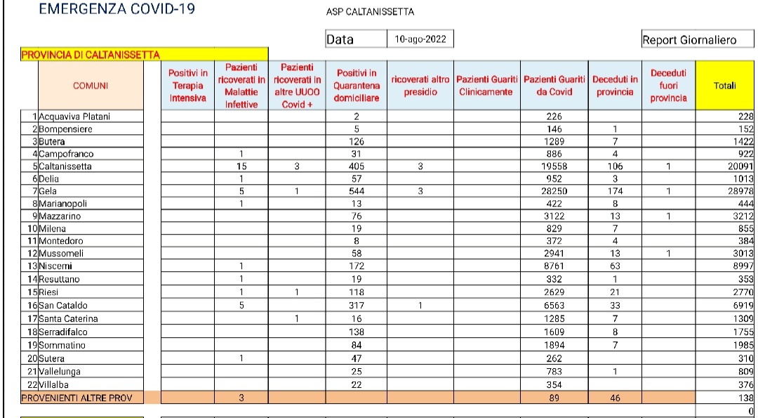Caltanissetta - Nelle ultime 24 ore riscontro di 84 pazienti positivi al SARS CoV-2, tutti in isolamento domiciliare: 23 pazienti di Gela, 14 di Caltanissetta, 6 di Riesi, 5 di Mussomeli, 5 di Niscemi, 5 di San Cataldo, 5 di Sutera, 4 di Campofranco, 4 di Mazzarino, 3 di Delia, 3 di Sommatino, 2 di Marianopoli, 2 di Santa Caterina Villarmosa, 1 di Butera, 1 di Montedoro e 1 di Serradifalco. Ricoverati in degenza ordinaria: 1 paziente di Caltanissetta, 1 di Gela e 1 di Delia. Trasferito dalla UOC Anestesia e Rianimazione alla degenza ordinaria 1 paziente di San Cataldo. Dimessi dalla degenza ordinaria: 2 pazienti di Gela, 1 di Niscemi e 1 di Caltanissetta. Guariti da Covid-19: 31 pazienti di Gela, 27 di Caltanissetta, 19 di Riesi, 12 di Mazzarino, 12 di Niscemi, 6 di San Cataldo, 5 di Delia, 4 di Mussomeli, 2 di Butera, 2 di Marianopoli, 2 di Sommatino, 1 di Acquaviva Platani e 1 di Vallelunga Pratameno.