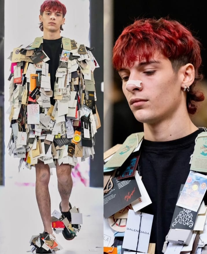 Holy Francisco a sorpresa apre la giornata della fashion week milanese tra lo stupore dei partecupanti indossando un insolito abito di Simon Craker, fatto di biglietti variopinti. Il marchio indossato riscuote molto successo tra i buyer di Hong Kong e Giappone.
