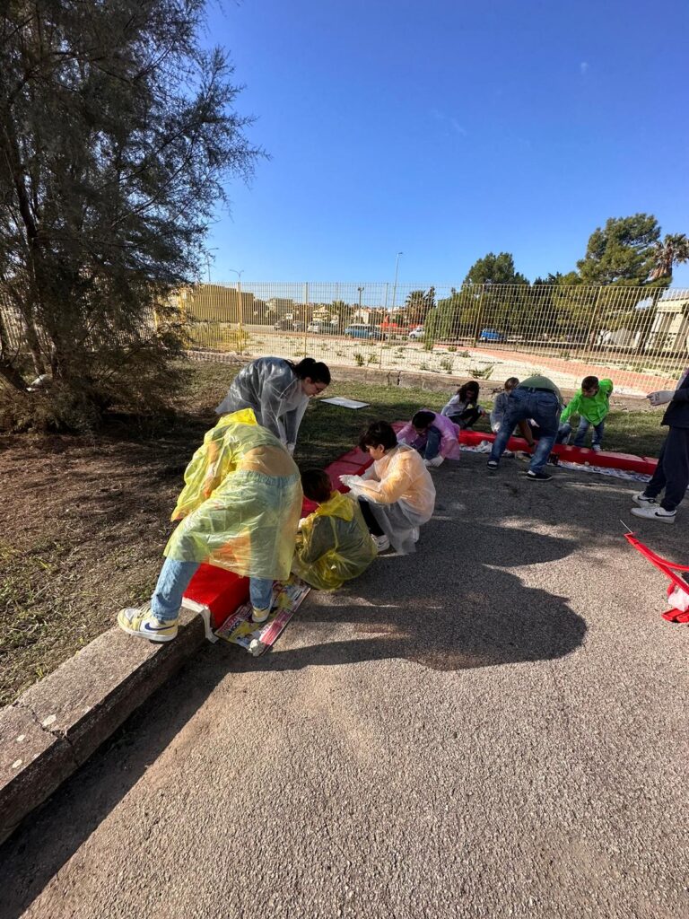 Gli scout del gruppo Agesci 4 si sono occupati del restauro della panchina ed i piccoli del Club Cuccioli hanno colorato di rosso il cordolo del marciapiede attorno. Le frasi sono state scelte dai ragazzi del plesso San Sebastiano.