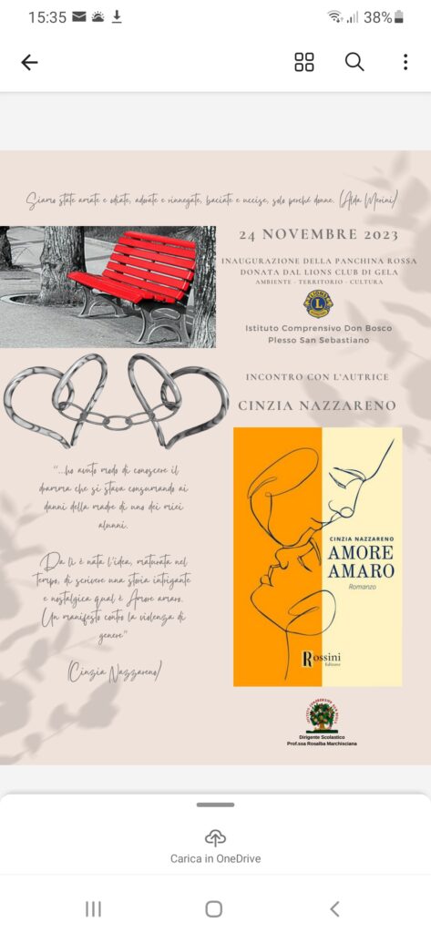 Una maggiore consapevolezza collettiva può renderci più forti di fronte a un fenomeno sociale da combattere. Ma che si può sconfiggere”. Alla cerimonia era presente la scrittrice niscemese Cinzia Nazzareno che ha presentato il suo libro ' Amore amaro' , inerente al tema.
