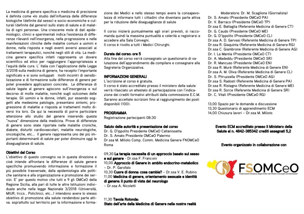 Dopo il saluto delle autorità e la presentazione del corso si entrerà nel merito dell'argomento facendo riferimento ad un approccio in ambito endocrino-metabolico, neurologico e non solo, per poi iniziare la tavola rotonda sullo "Stato dell'arte della Medicina di Genere nelle nostre realtà", durante la quale interverranno i presidenti e i referenti di Medicina di Genere di tutti gli Ordini siciliani.