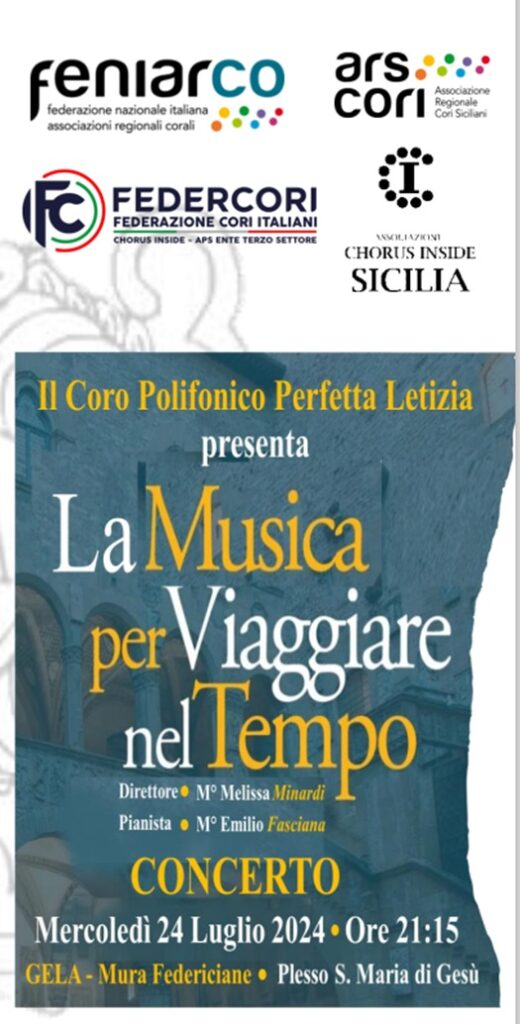 Questo il titolo del concerto inedito che il Coro Polifonico Perfetta Letizia, diretto dal M° Melissa Minardi, coadiuvato al pianoforte dal M° Emilio Fasciana, regalerà al pubblico gelese MERCOLEDI’ 24 LUGLIO c/o la location delle Mura Federiciane all’interno del Plesso scolastico S.Maria di Gesù. Start alle ore 21:15.