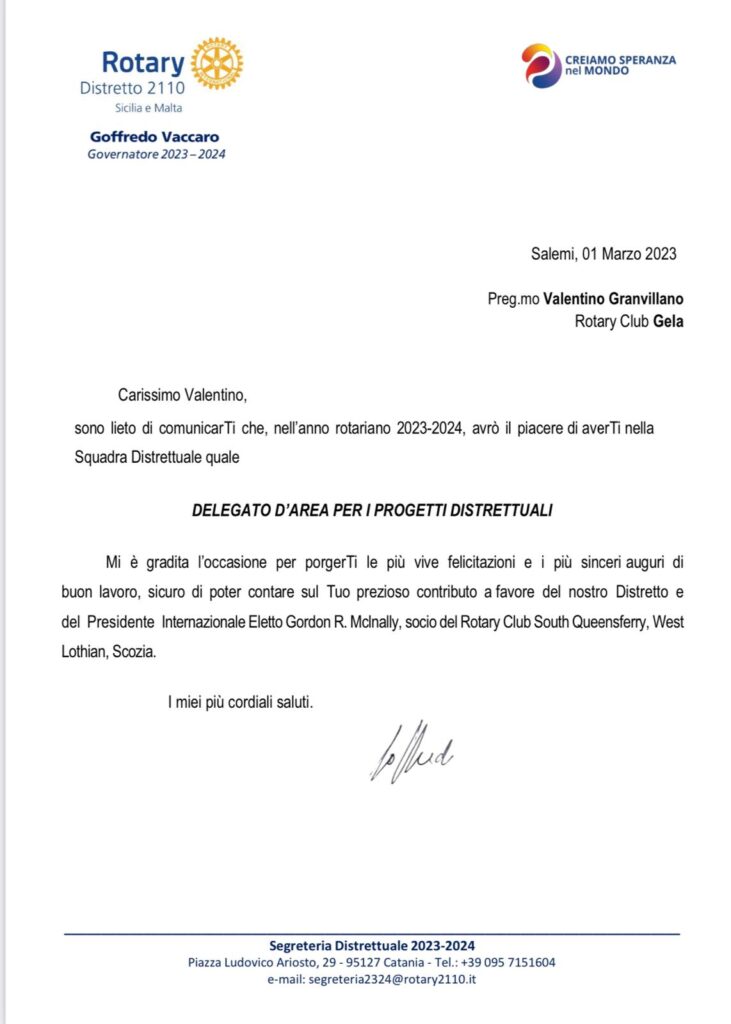 Sette mesi di attivita' sociale spalmata in ogni settore ed in tutte le fasce di eta'; una sede prestigiosa prestata alla struttura associativa, punto di riferimento di tanti rotariani locali e del comprensorio; impegno sociale a tutto tondo. Tutto questo non è passato inosservato al Distretto che ha conferito un importante riconoscimento al Rotary club Gela che viene premiato in questo anno di grande attività all'insegna del service collettivo. L' Avv. Valentino Granvillano, attuale Presidente del Rotary club Gela è stato designato dal Governatore Goffredo Vaccaro nella sua squadra distrettuale con l'incarico di Delegato d'Area per i Progetti Distrettuali per l'anno rotariano 2023-2024. Assieme a lui anche il Dott. Manlio Galatioto, designato con l'incarico di Delegato d'area per la Rotary Foundation per l'anno rotariano 2023-2024.