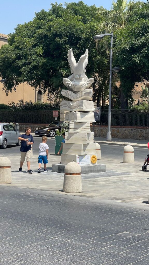 Ed infatti, dopo il murales dell’ex chiesa di San Rocco in centro storico, il murales raffigurante i giudici Falcone e Borsellino, la riqualificazione della stazione centrale, stamane è stata inaugurata l’opera Librarsi, realizzata dal maestro scultore Leonardo Cumbo ed installata presso Largo San Biagio. L’opera in pietra, che ha un’altezza di 4,50 metri rappresenta l’evoluzione della comunicazione da quando si scriveva nella pietra, a seguire nei papiri a seguire nelle pagine dei libri per poi volare come di fatto oggi l’Internet lettere permette.