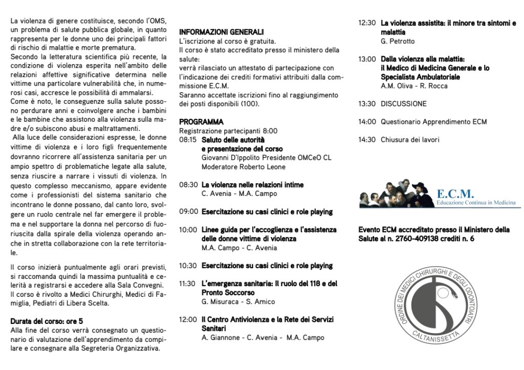 Durante la mattina gli interventi dei diversi relatori saranno intervallati da esercitazioni su casi clinici e role playing. Tra i vari argomenti si farà riferimento al ruolo del 118 e del pronto soccorso, si parlerà del Centro Antiviolenza e della Rete dei Servizi Sanitari, ma anche di minori e delle linee guida per l'accoglienza e l'assistenza delle donne vittime di violenza.
