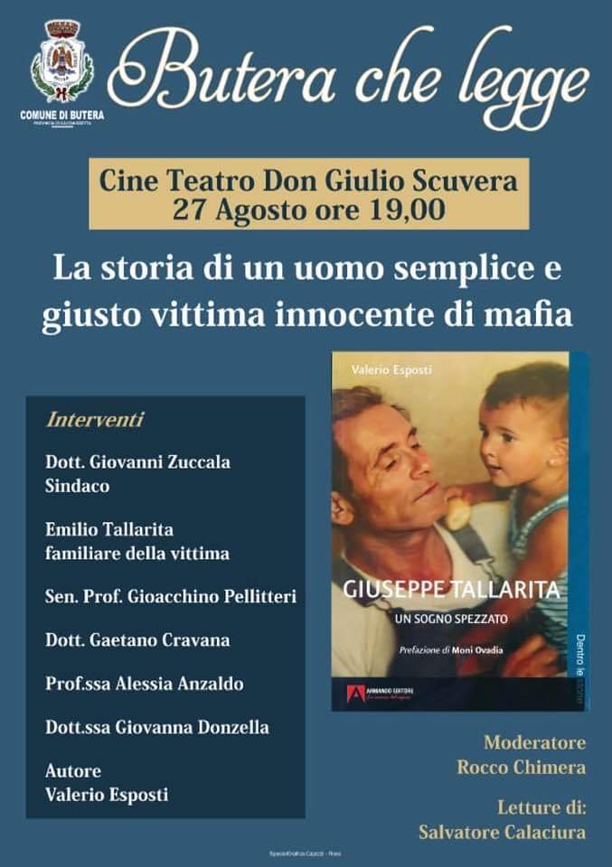 Domenica 27 Agosto 2023 il tour ha fatto tappa al cine teatro “ Don Giulio Scuvera” di Butera qui è avvenuta la seconda presentato il libro di Valerio Esposti, giornalista e pubblicista lodigiano, con due pubblicazioni nel euo curriculo: 'C’era una volta il buio' ( 2009) e 'Fino all’ultimo round', finalista nel 2014 del premio Bancarella sport. In una sala affollata, si é svolta la serata moderata dallo scrittore Rocco Chimera, con letture di Salvatore Calaciura.