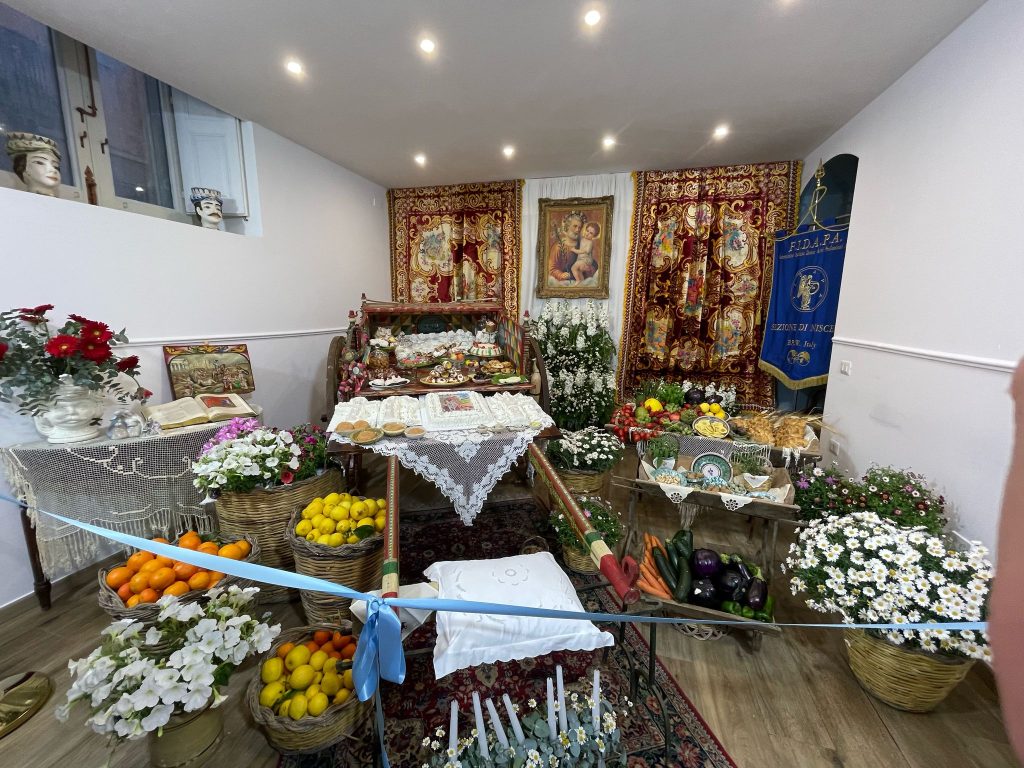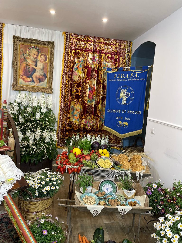 Un carretto siciliano istoriato in tutti i suoi lati, secondo la più antica tradizione ed imbadito di ogni ben di Dio, come fosse una tavola. Arazzi finemente decorati alle pareti. Cesti di fiori e frutta. Un arcobaleno di odori puri della campagna e di fiori freschi. E poi il simbolo della città: i carciofi che adornano l'ingresso, come un segno di benvenuto e prosperità. Questo è stata l'interpretazione della Fidapa diretta da Lucia Spata, dell'altare di San Giuseppe a Niscemi.